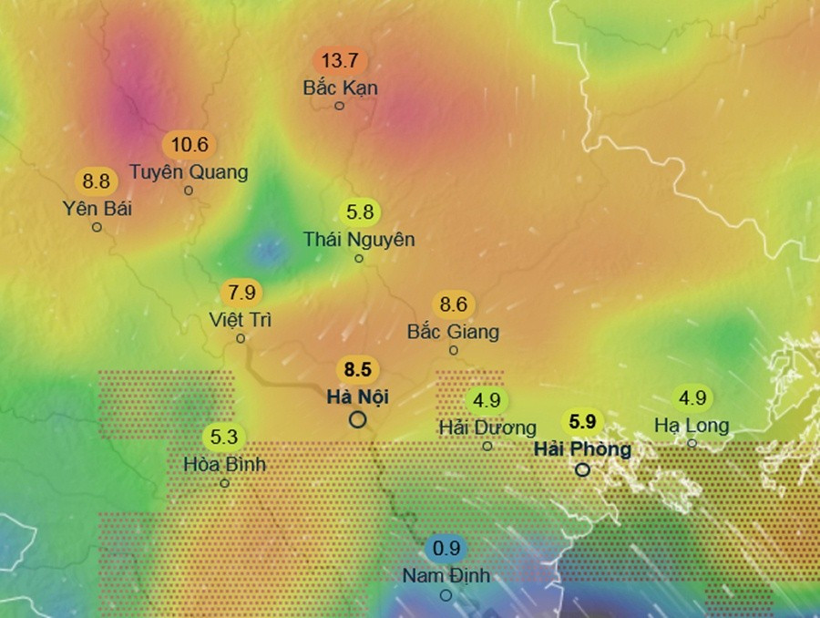 Dự báo mưa diện rộng ở miền Bắc vào ngày 6/10 (những con số trong hình là lượng mưa dự báo trong khoảng 3 giờ, tính theo mm). Ảnh: Ventusky, GFS.