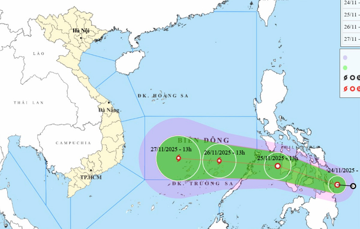 Ngoài ra, theo nhận định của Cục Khí tượng thủy văn, trong sáng nay (24/11), cường độ bão mạnh nhất dự kiến khi đi qua khu vực phía Bắc đặc khu Trường Sa có thể đạt cấp 10, giật cấp 13, sau đó, bão di chuyển theo hướng Tây, hướng về đất liền Nam Trung Bộ, trọng tâm ảnh hưởng từ khu vực Gia Lai đến Lâm Đồng (vùng từ Bình Định đến Bình Thuận cũ). Thời gian ảnh hưởng chính trong khoảng 28–30/11.