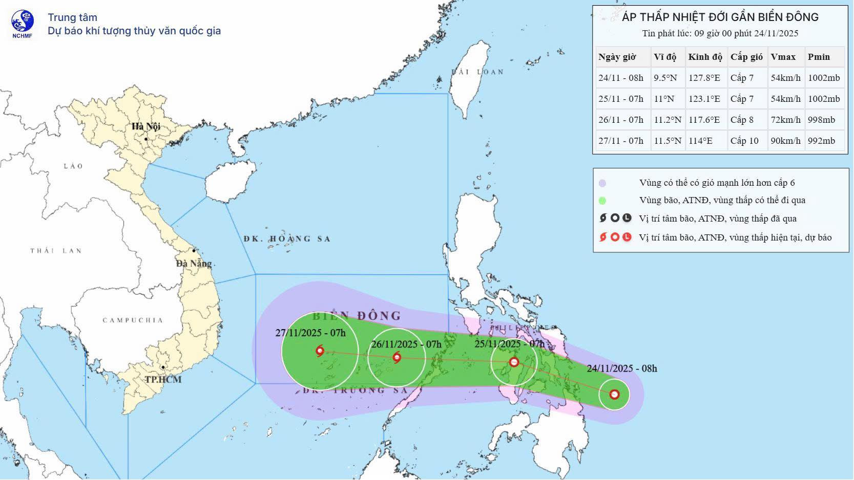 Trong 24 giờ sau đó, ATNĐ có khả năng mạnh lên thành bão, di chuyển hướng Tây, khoảng 20-25km/h, đi vào Biển Đông. Đến 7h ngày 26/11, vị trí tâm bão trên vùng biển phía Đông Nam khu vực giữa Biển Đông. Cường độ gió lúc này tăng lên cấp 8, giật cấp 10.