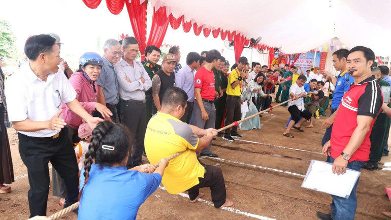 Các dân tộc anh em tham gia trò chơi kéo co tại Ngày hội "Đại đoàn kết toàn dân tộc".