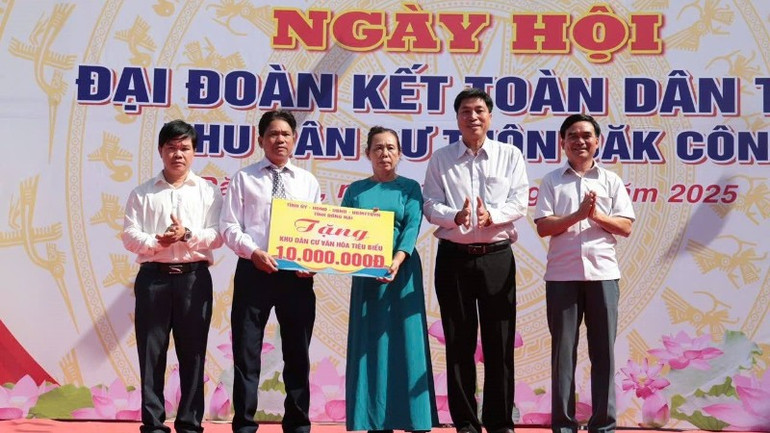 Nhân dịp Ngày hội “Đại đoàn kết toàn dân tộc”, đồng chí Lê Hoàng Nam đã biểu dương “Khu dân cư tiêu biểu năm 2025” và tuyên dương 5 hộ gia đình tiêu biểu, trong đó khu dân cư tiêu biểu khen thưởng10 triệu đồng, mỗi cá tiêu biểu nhận 1 triệu đồng; trao10 phần quà cho các hộ gia đình có hoàn cảnh khó khăn trên địa bàn thôn, mỗi phần quà trị giá khoảng 400.000 đồng/người.