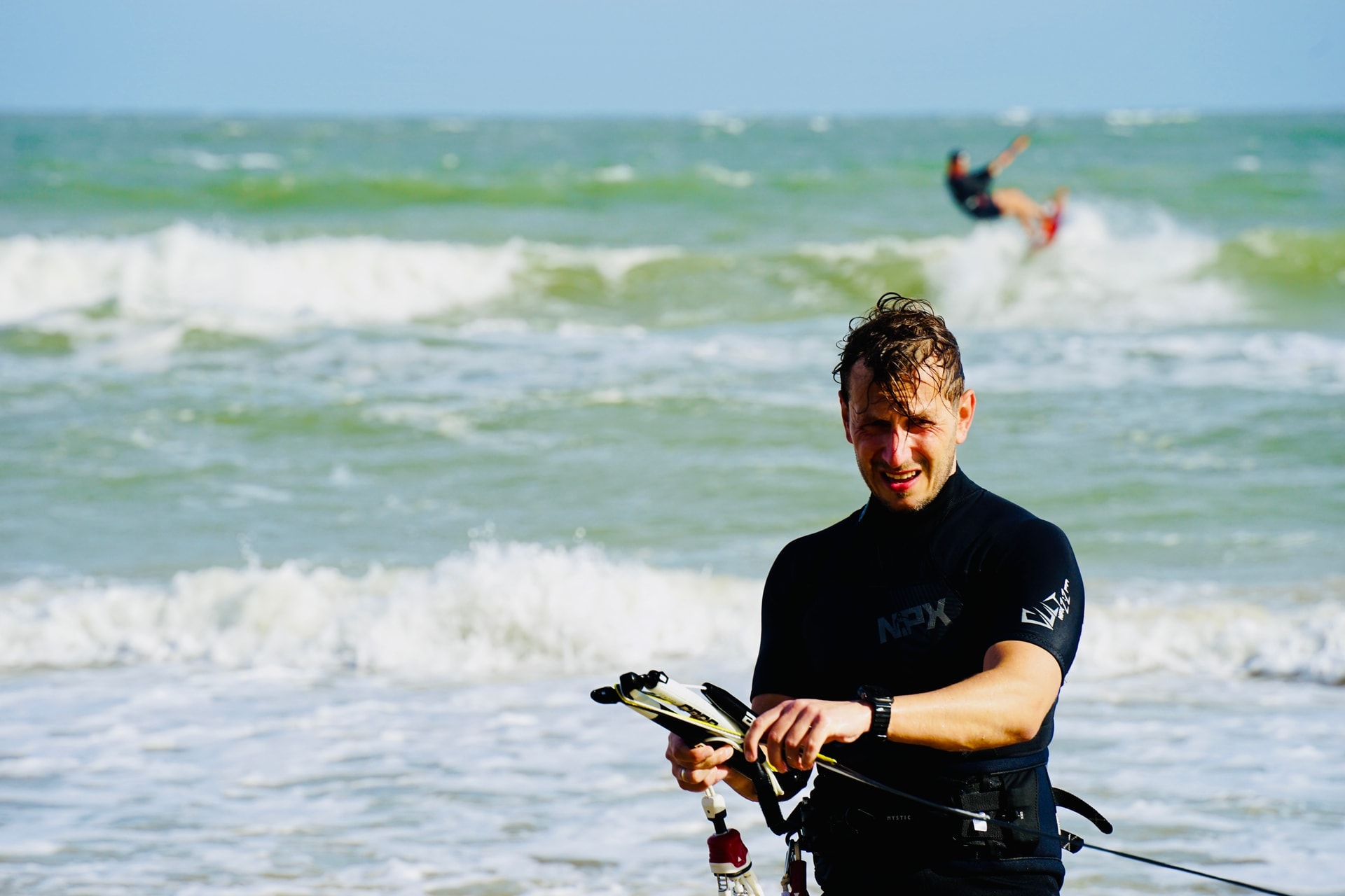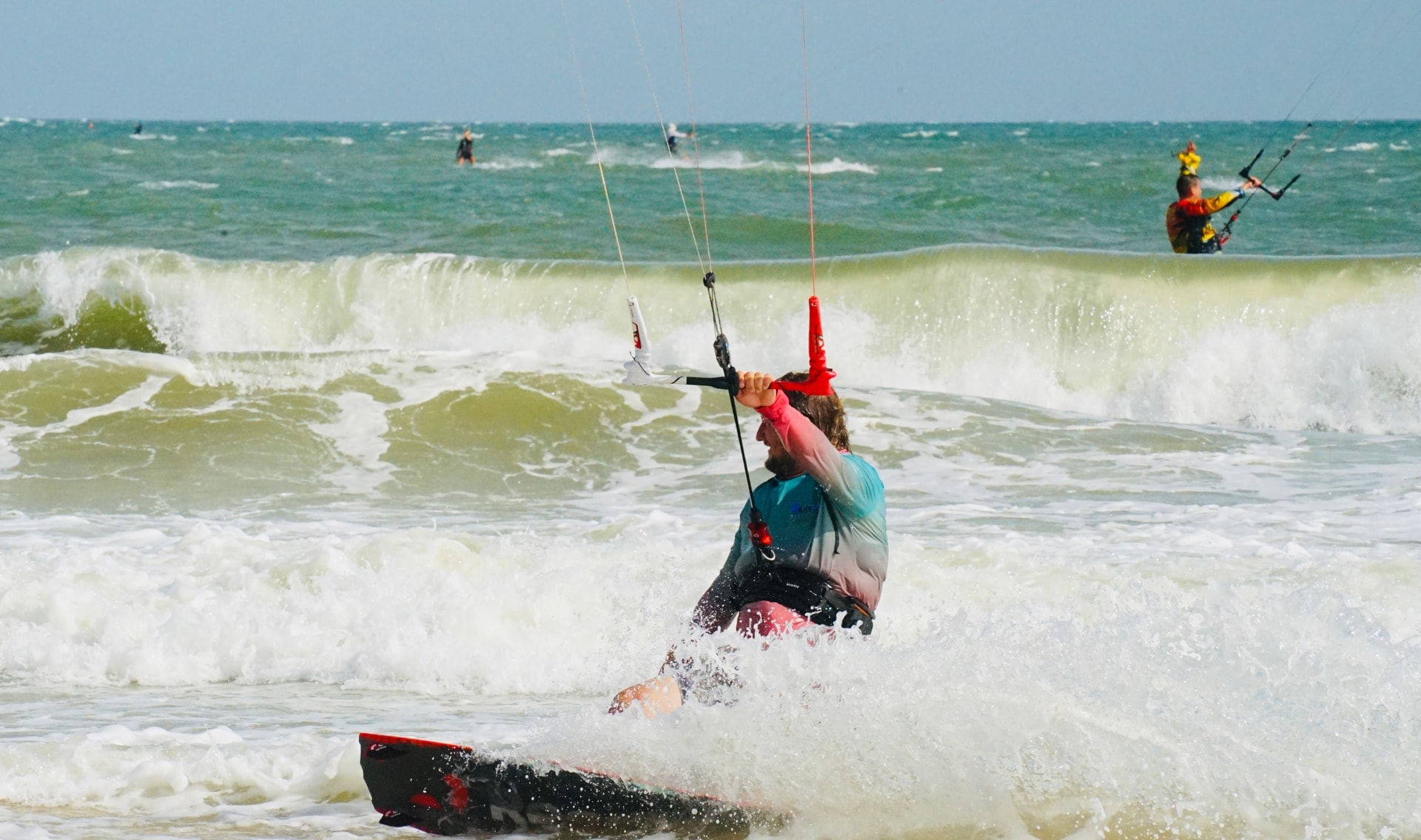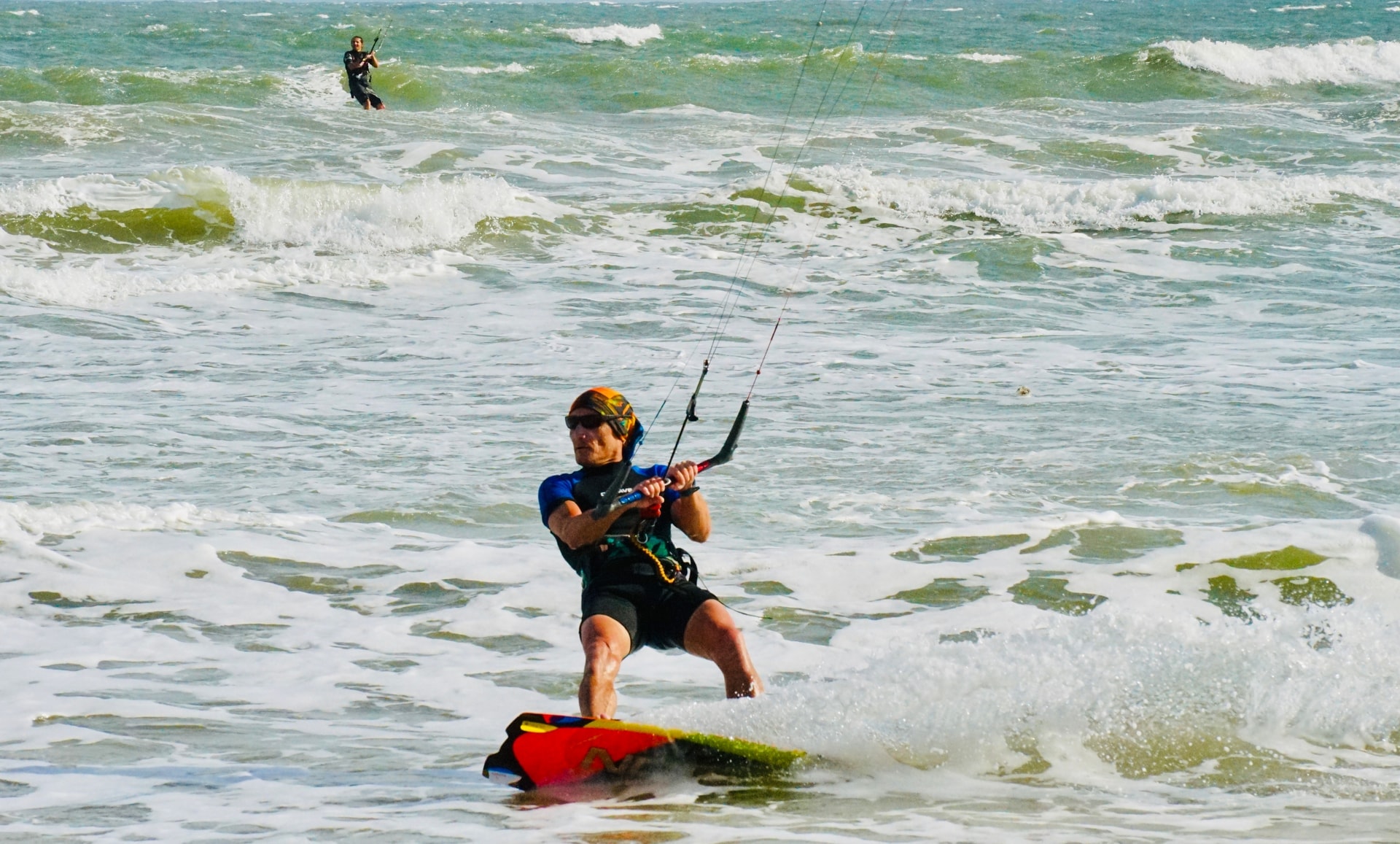 Người chơi điều khiển diều và ván chuyên dụng, tạo nên những màn trình diễn đẹp mắt trên mặt nước
