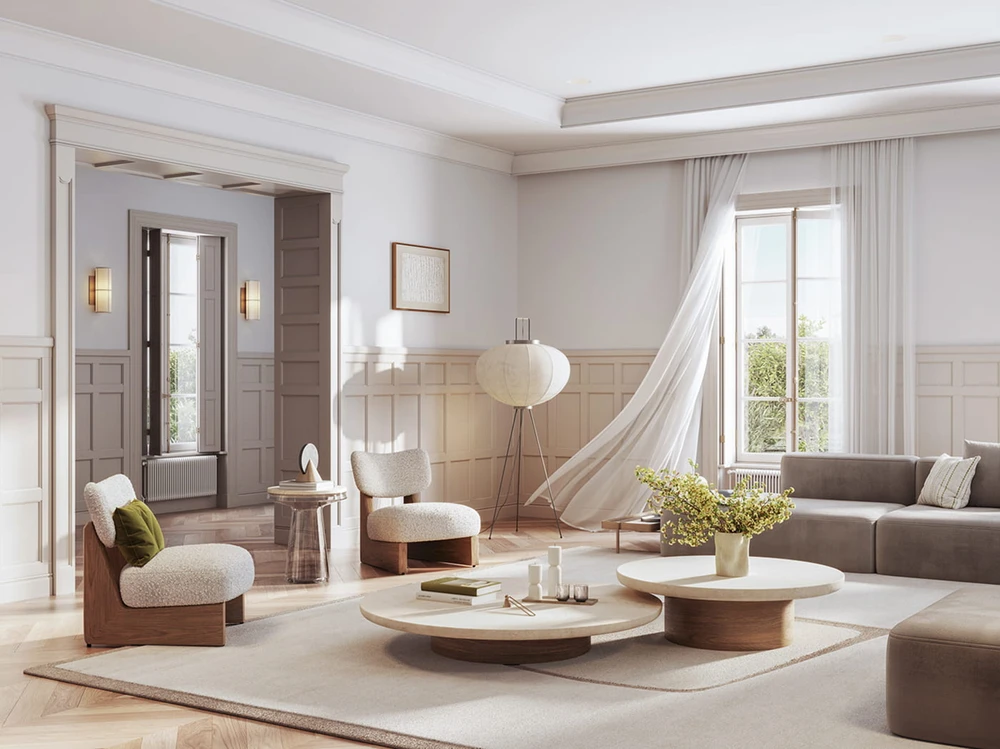 Màu sắc trung tính là yếu tố đặc trưng của phong cách này. Các gam trắng, kem và xám nhạt thường được sử dụng làm nền, giúp không gian sáng hơn và mở rộng về mặt thị giác. Trong điều kiện nhà ở đô thị, bảng màu này còn hỗ trợ tối ưu ánh sáng tự nhiên và tạo sự liền mạch cho tổng thể. Những điểm nhấn màu sắc được tiết chế, thường đến từ gỗ tự nhiên, cây xanh hoặc đồ trang trí thủ công, đủ để tạo chiều sâu mà không gây rối mắt.