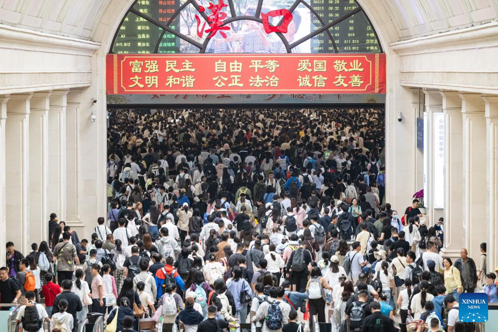 Theo giới chức Trung Quốc, vào ngày 30/9, lượng hành khách tăng vọt lên 18,4 triệu lượt. Trong ảnh là hành khách chen chúc nhau vào Ga đường sắt Hán Khẩu ở Vũ Hán, tỉnh Hồ Bắc, miền trung Trung Quốc, vào ngày 1/10. Ảnh: Tân Hoa Xã.