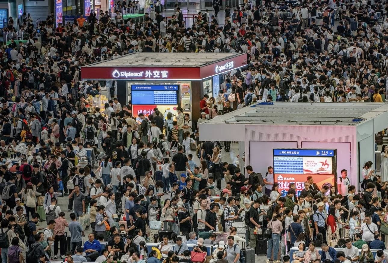Biển người tại ga tàu Hồng Kiều, Thượng Hải vào ngày 28/9. Bắt đầu từ ngày 1/10 cả đất nước Trung Quốc bước vào kỳ nghỉ lễ kép Quốc khánh - Trung thu kéo dài tới 8 ngày, một “làn sóng di chuyển” khổng lồ đã đồng loạt bùng nổ. Ảnh: Reuters.