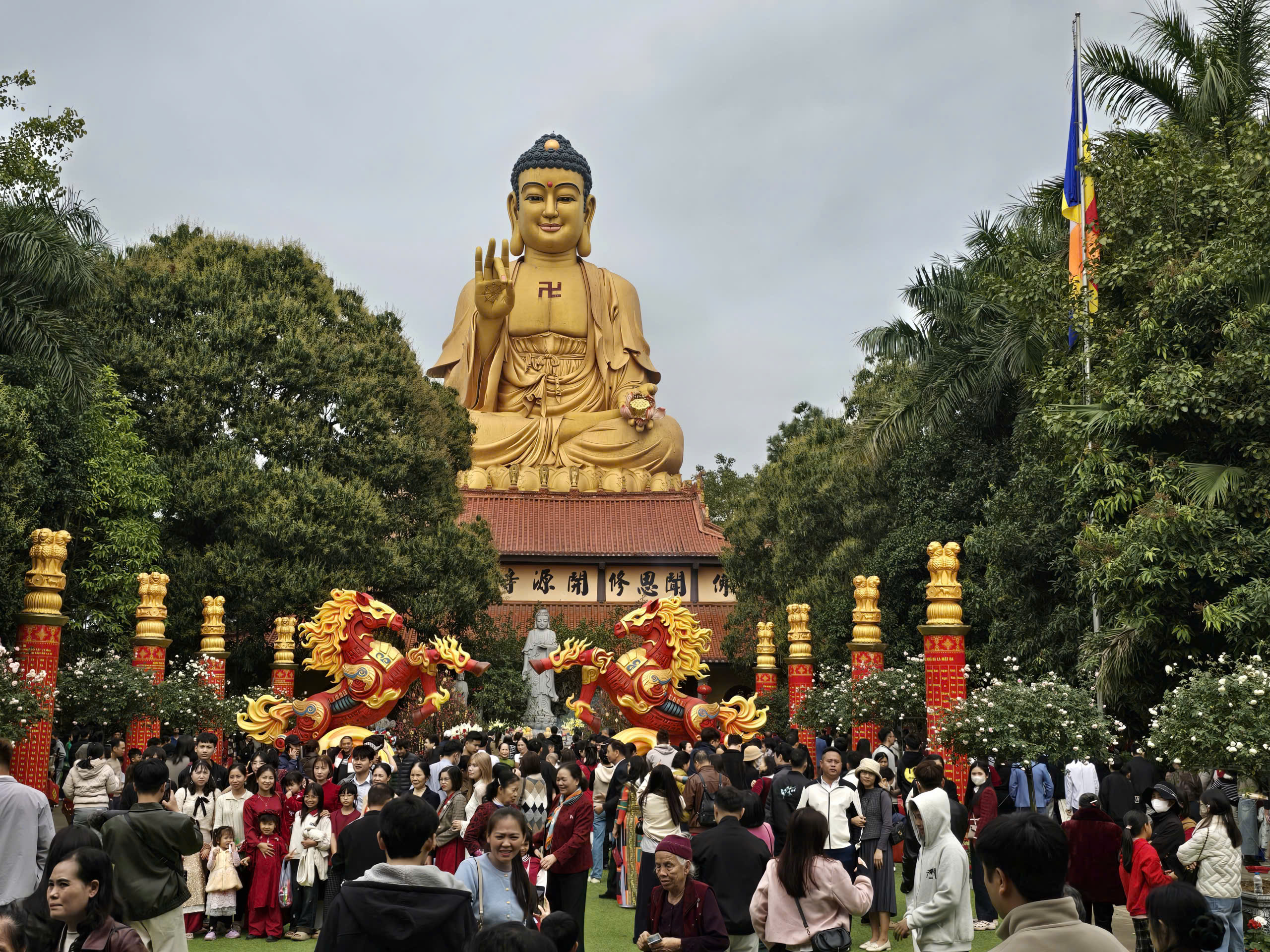 Người dân và du khách chụp ảnh lưu lại khoảnh khắc đầu năm bên đại tượng Phật.
