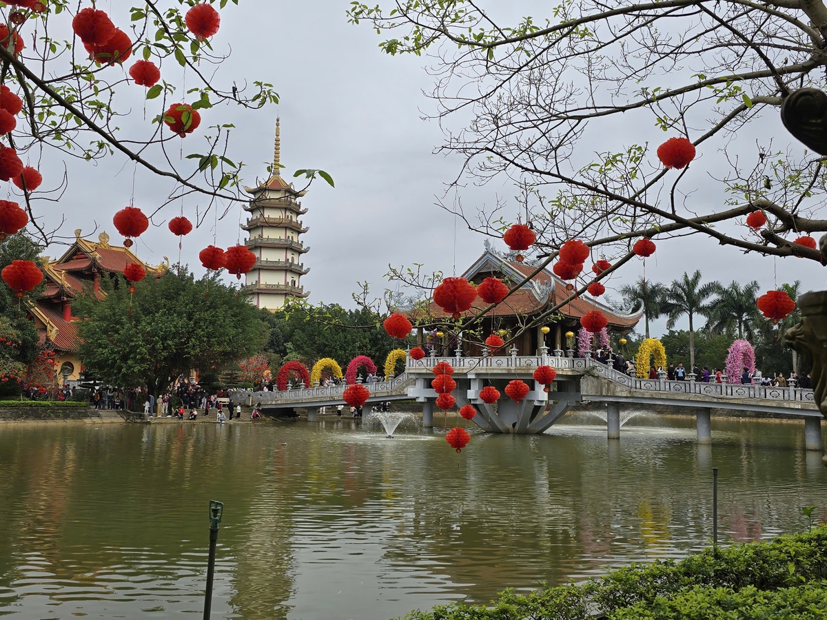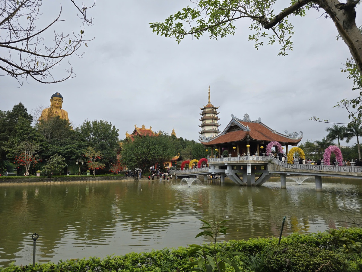 Phía trước chùa Khai Nguyên là hồ nước trong xanh, giữa hồ là lầu gác mô phỏng chùa Một Cột.
