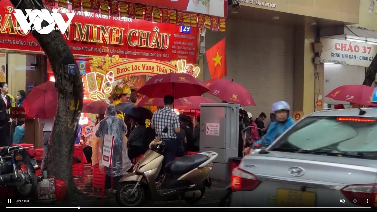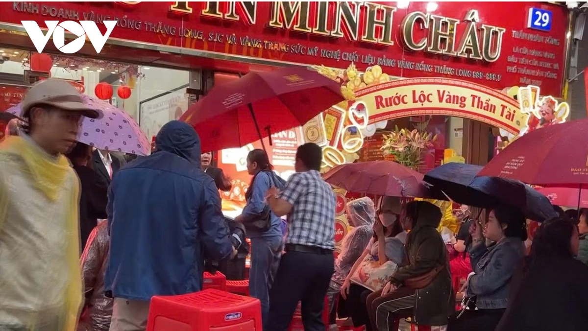 Ghi nhận trong sáng mùng 10 cho thấy, khu vực được mệnh danh là “phố vàng” ken đặc người. Dưới làn mưa và cái lạnh đầu năm, người dân mặc áo mưa, che ô đứng san sát nhau để chờ đến lượt vào giao dịch. Trước các cửa hàng như Công ty Vàng bạc Bảo Tín Minh Châu, Tập đoàn Vàng bạc Đá quý DOJI và Phú Quý, dòng người xếp hàng kéo dài, tràn kín vỉa hè.