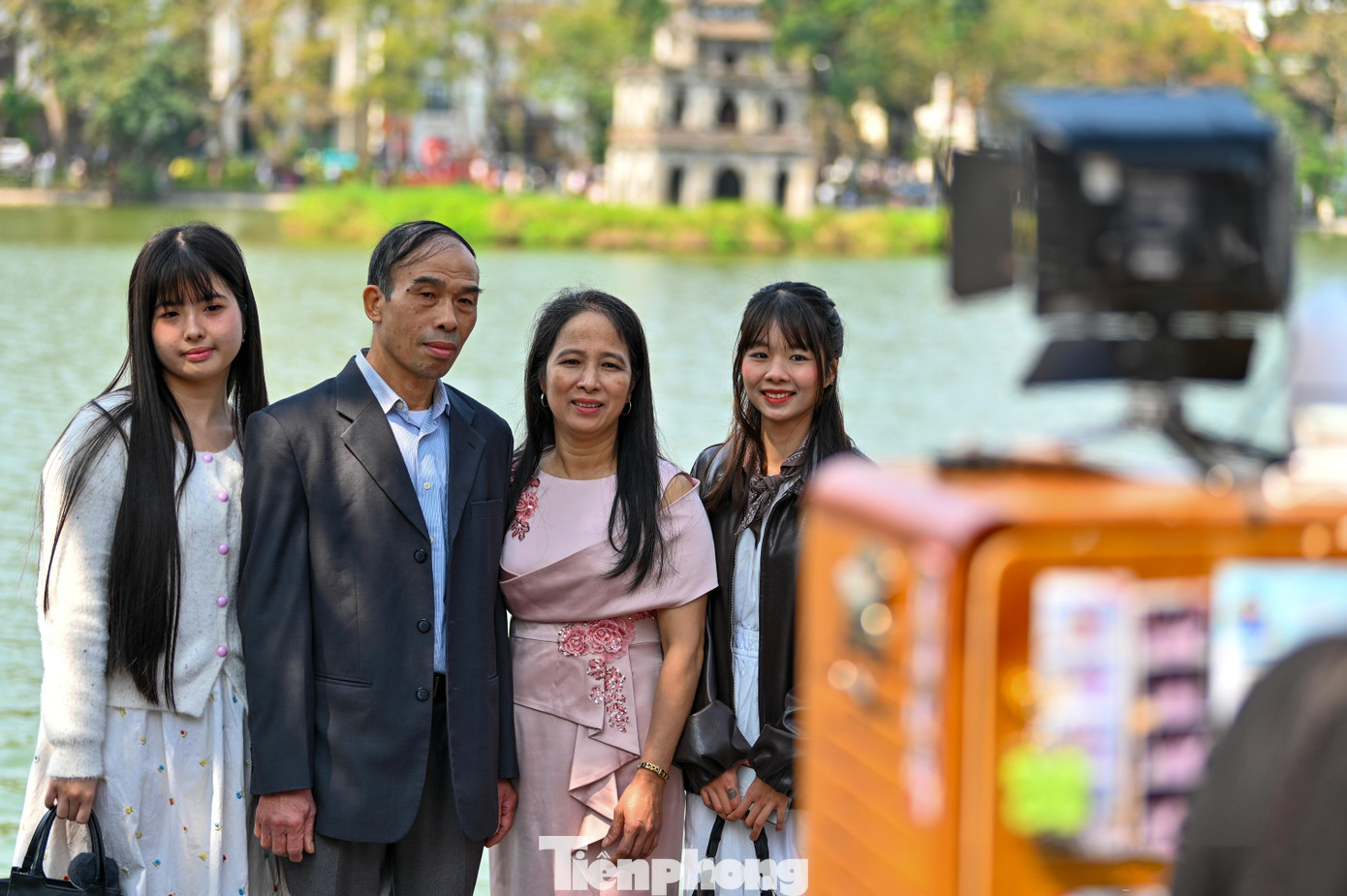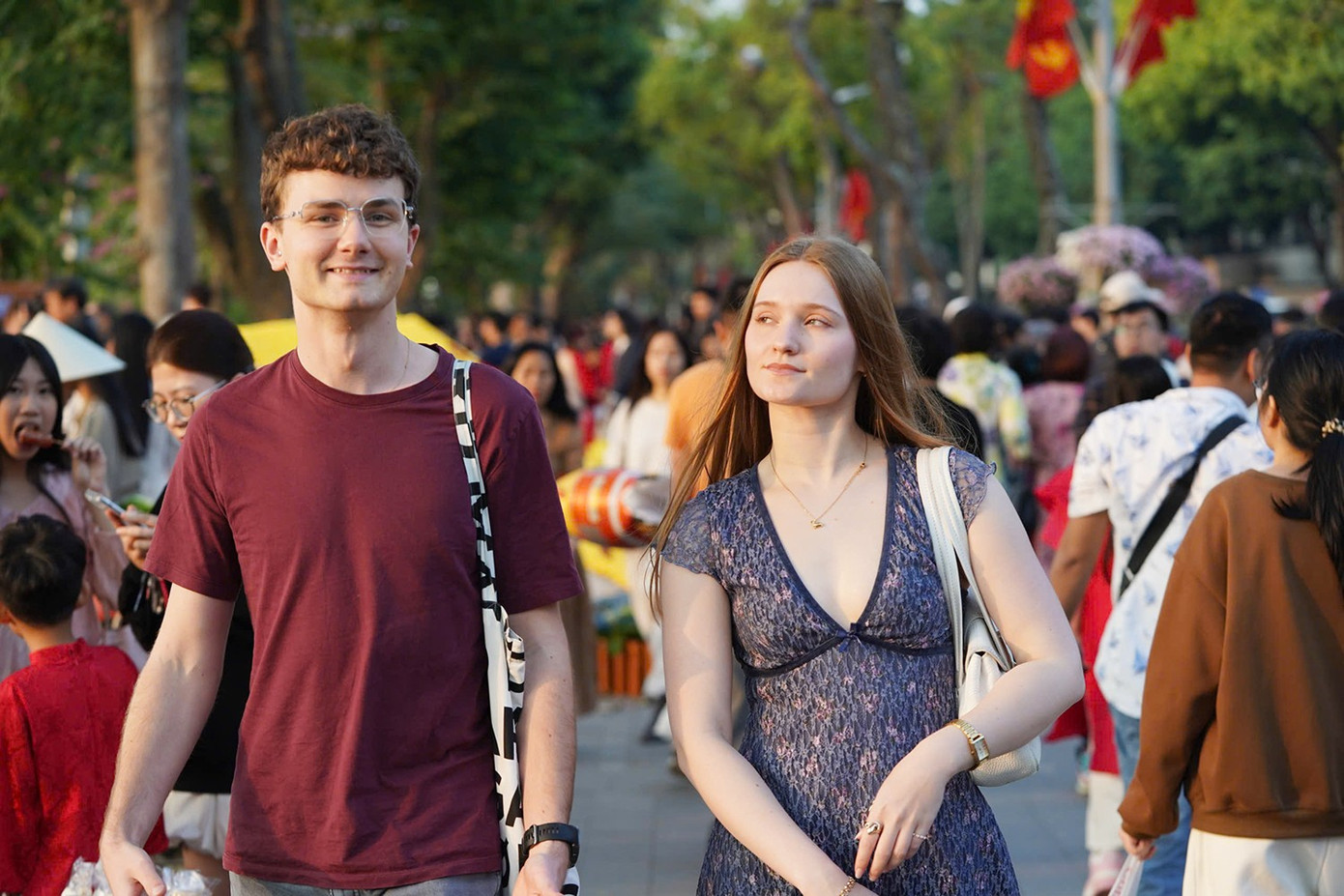 Không chỉ người dân Thủ đô và khách ngoại tỉnh, nhiều du khách nước ngoài cũng hòa mình vào không khí Tết Việt. Trên bờ hồ, dễ dàng bắt gặp hình ảnh các nhóm khách châu Âu, Hàn Quốc, Nhật Bản dừng lại quan sát hoạt động du xuân, chụp ảnh bên sắc đào và tìm hiểu phong tục đi lễ đầu năm.