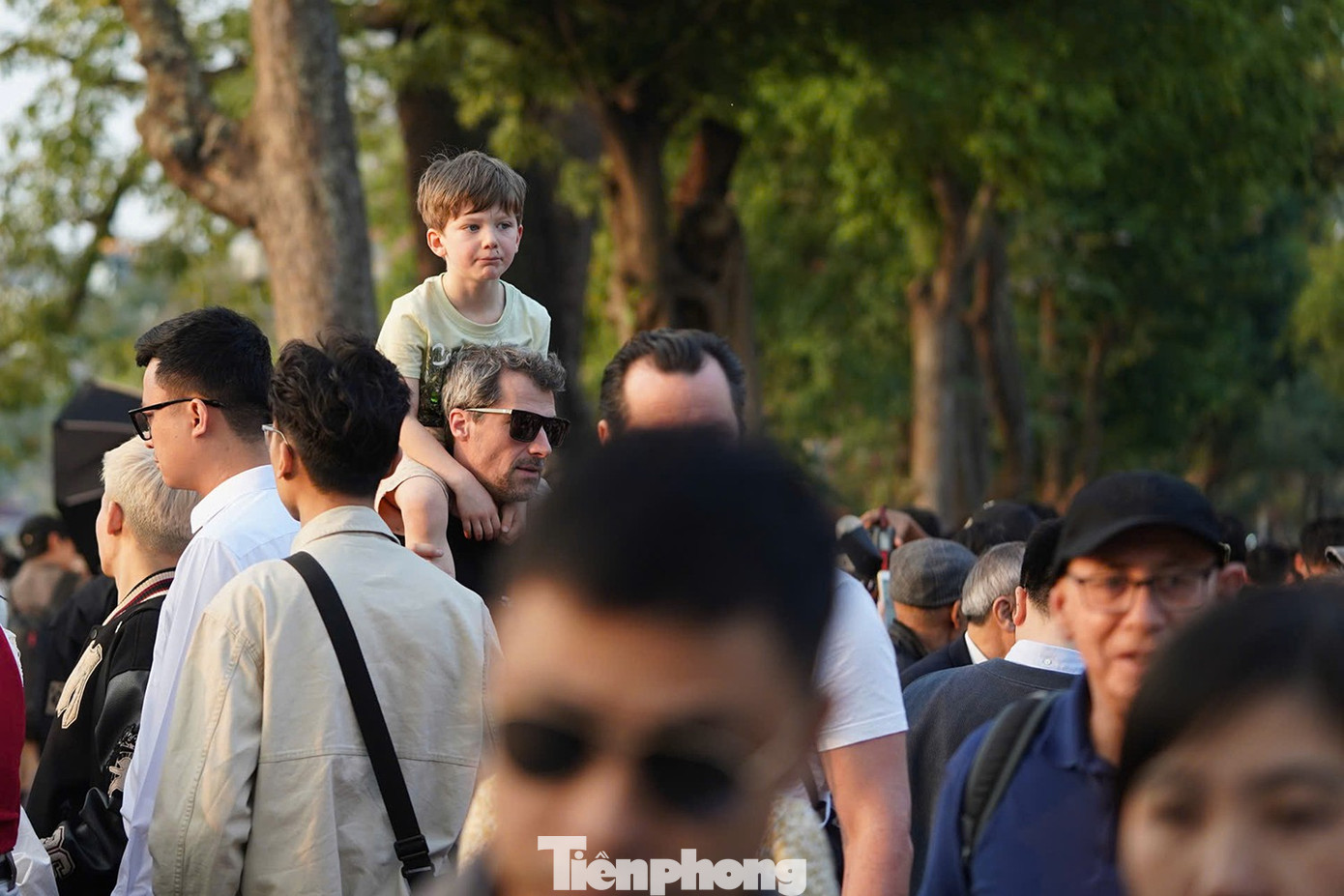 Đến cuối giờ chiều, lượng người quanh bờ hồ vẫn ở mức cao. Không khí nhộn nhịp kéo dài đến tối, biến hồ Gươm tiếp tục trở thành điểm du xuân đông đúc nhất Thủ đô trong ngày mùng 4 Tết.