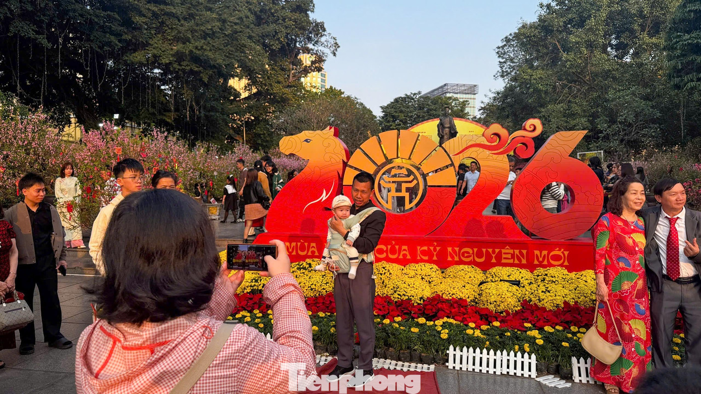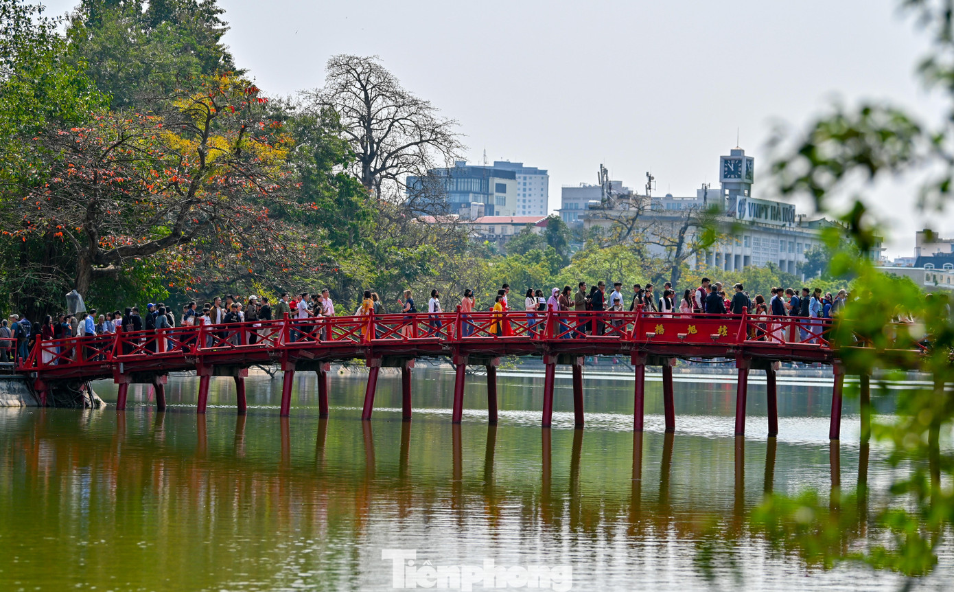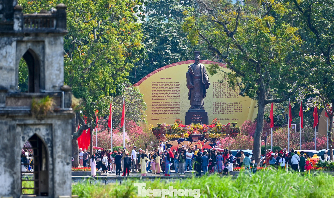 Sức hút của hồ Gươm trong ngày mùng 4 đến từ nhiều yếu tố. Ngoài yếu tố thời tiết đẹp và kỳ nghỉ Tết còn dài, khu vực trung tâm được trang trí cảnh quan, hoa xuân tạo điểm nhấn thị giác. Đáng chú ý, không gian trưng bày khoảng 300 gốc đào cổ thụ tại Công viên Lý Thái Tổ thu hút đông người dừng chân chụp ảnh, góp phần kéo dài thời gian lưu lại của du khách quanh hồ.