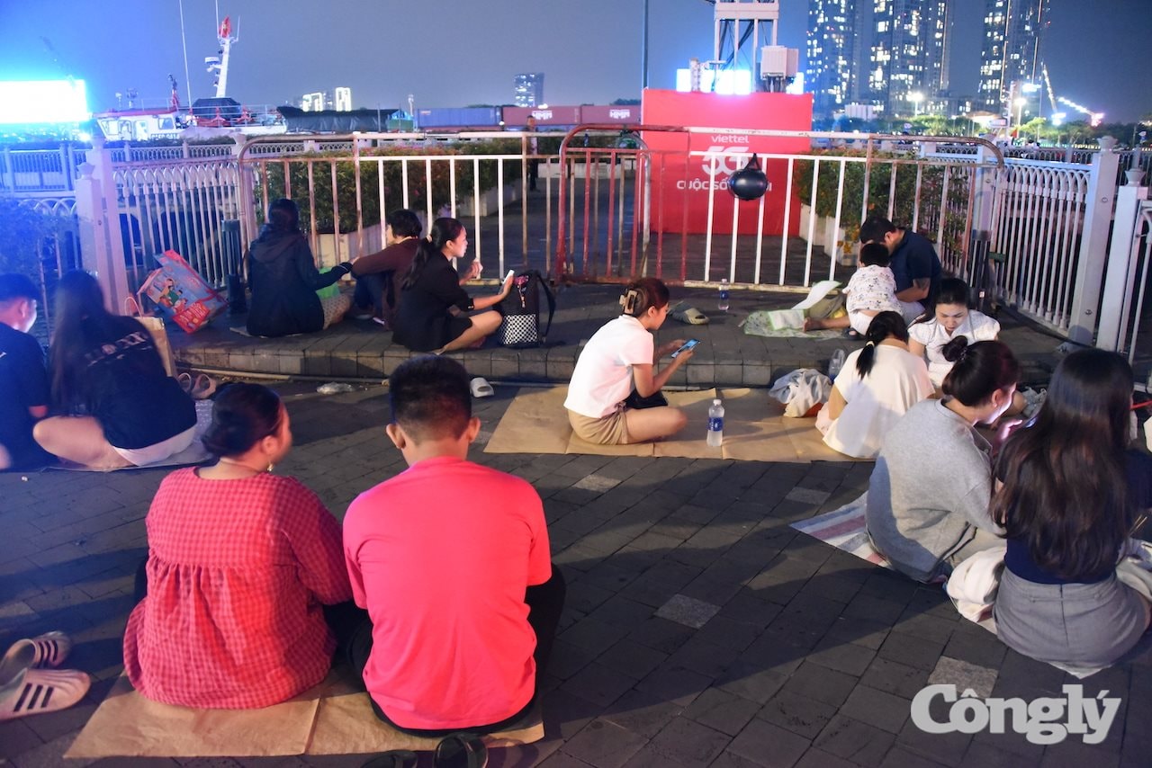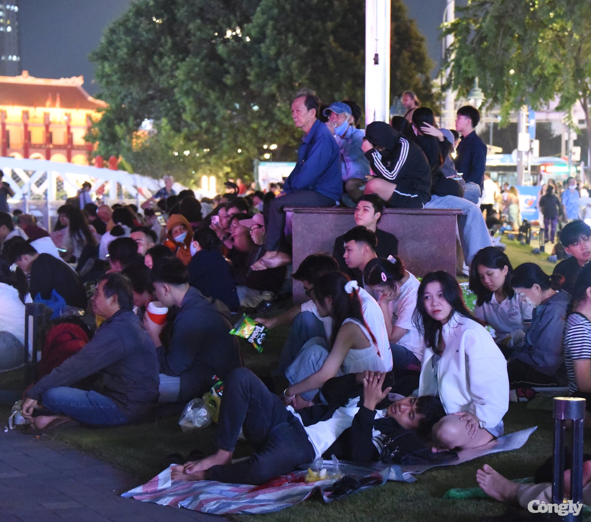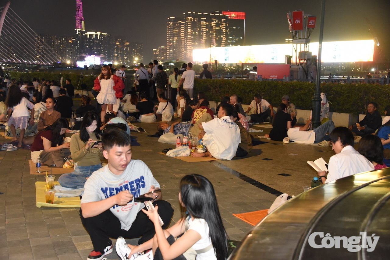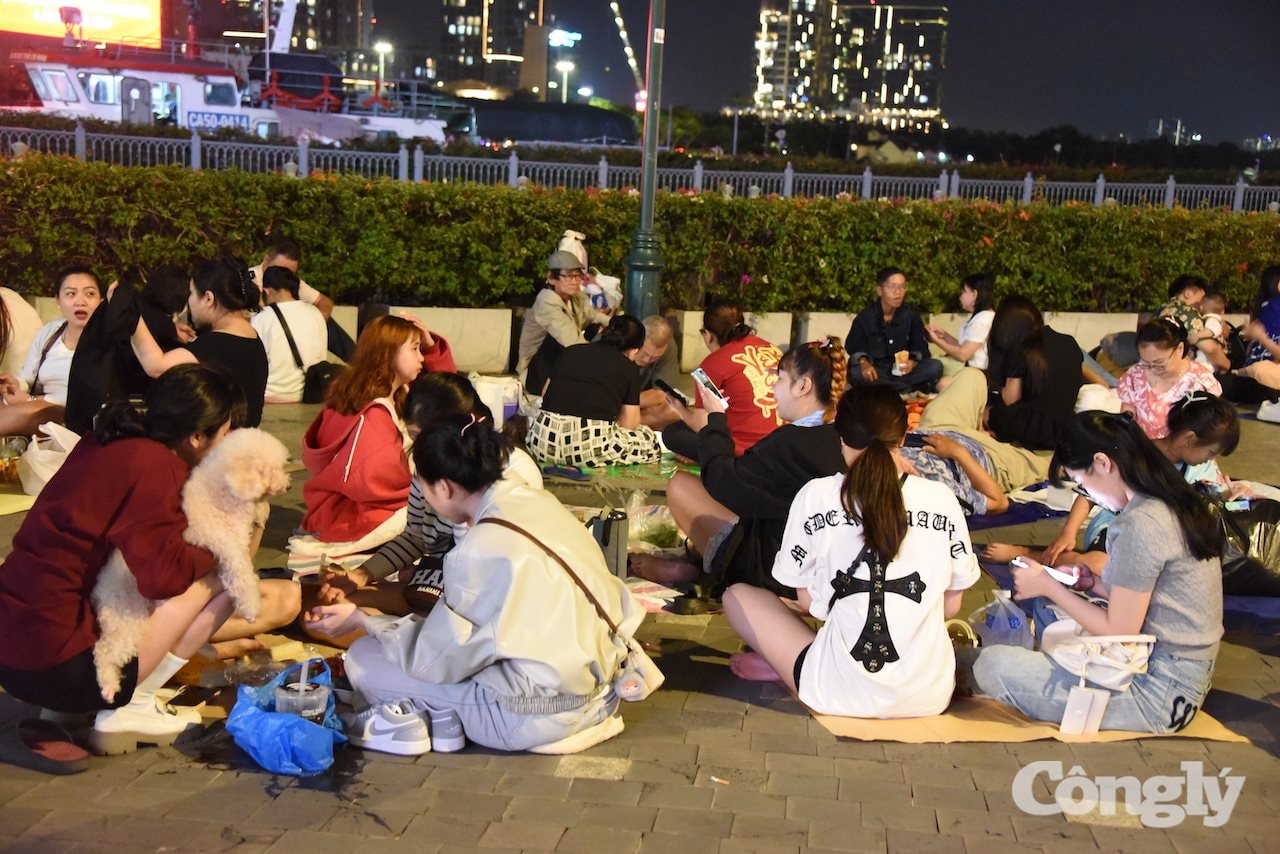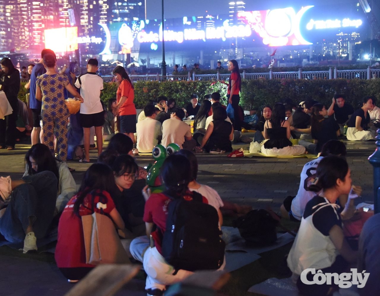 Nhiều nhóm bạn trẻ, gia đình mang theo bạt, đồ ăn, nước uống, vừa trò chuyện vừa chờ đợi khoảnh khắc chuyển giao sang năm mới.