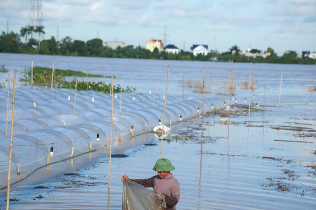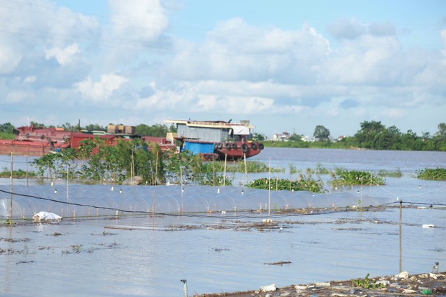 Hàng loạt luống hoa bị ngập nước hoàn toàn. Người dân thôn Hồng Hà 2 cho biết, khoảng 1h ngày 1/10, nước bắt đầu dâng lên, đến 17h thì ngập sâu như trên hình.
