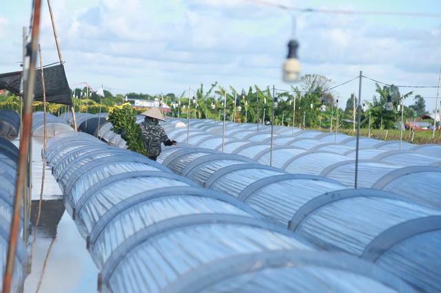 Nông dân đội nón lá, tay ôm bó hoa ướt sũng, ánh mắt lo âu khi cả mùa vụ đứng trước nguy cơ mất trắng.