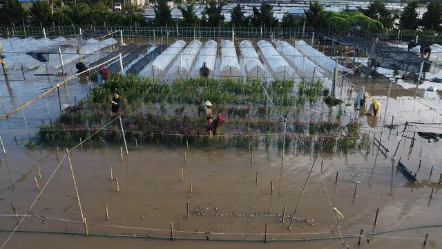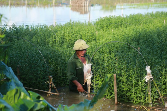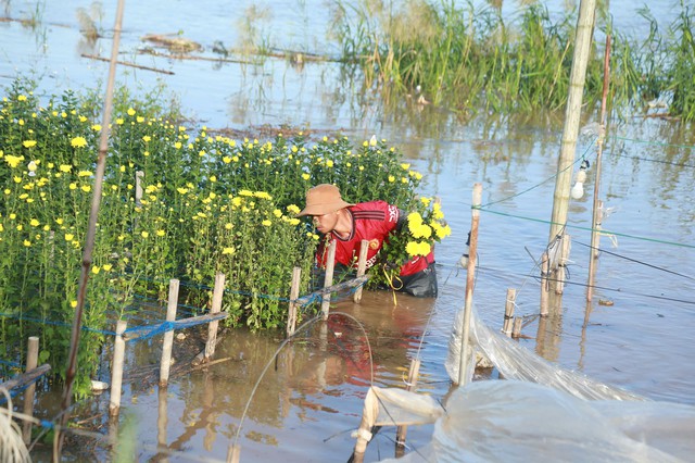 Người dân lội ruộng ngập nước, vội vã cắt từng nhành hoa bị ảnh hưởng.