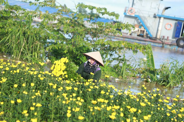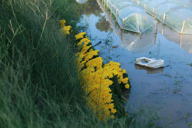 Những luống hoa cúc, hoa đồng tiền ngả rạp trong nước. Người dân cho biết, họ tranh thủ thu hoạch vớt vát được đồng nào hay đồng đó.