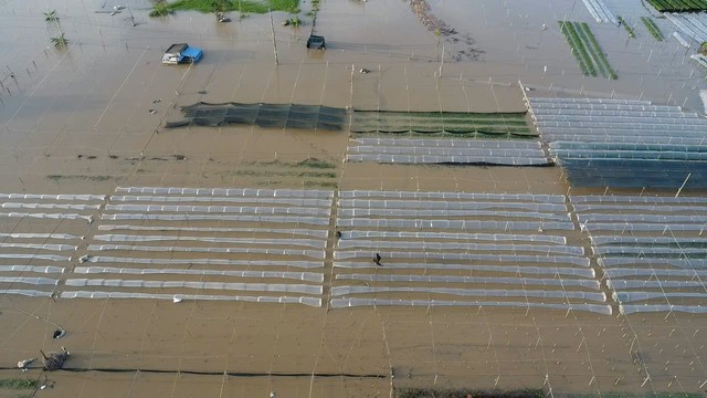 Giữa "biển nước" mênh mông, những cánh đồng hoa bị ngập, người dân tất tả thu hoạch, bán tháo để vớt vát chút vốn liếng, mong cứu lấy phần nào công sức cả năm.