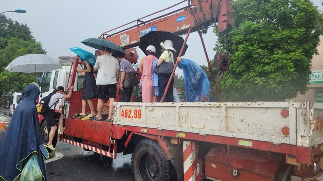 Nhiều người đi và trở về căn nhà của mình thông qua chiếc xe tải, với thời gian 30-60 phút, tùy lượng khách. Anh Nam ví von đi trong trời mưa băng qua những dòng nước, chiếc xe tải cẩu này giống "tàu Titanic".