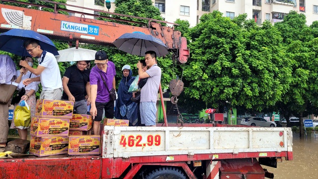Trưa ngày 1-10, tại khu đô thị Resco Phạm Văn Đồng, nơi có nhiều tòa chung cư đang trong tình cảnh ngập sâu, cư dân chung cư di chuyển thông qua chiếc xe tải gắn cẩu tự hành, mỗi chuyến 30-60 phút, tùy lượng người.