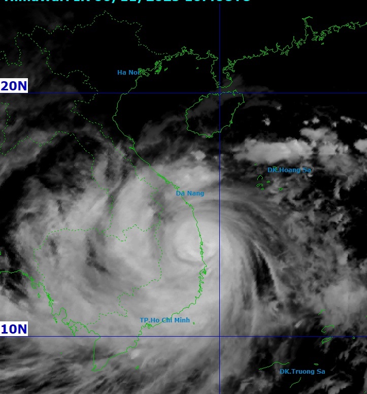 Ảnh vệ tinh bão số 13 (Kalmaegi) lúc 18h ngày 6/11 ghi nhận tâm bão nằm ven bờ biển Đắk Lắk - Gia Lai. Bão giữ hướng di chuyển Tây Tây Bắc với tốc độ 30 km/h và đi sâu vào đất liền. Ảnh: NCHMF.
