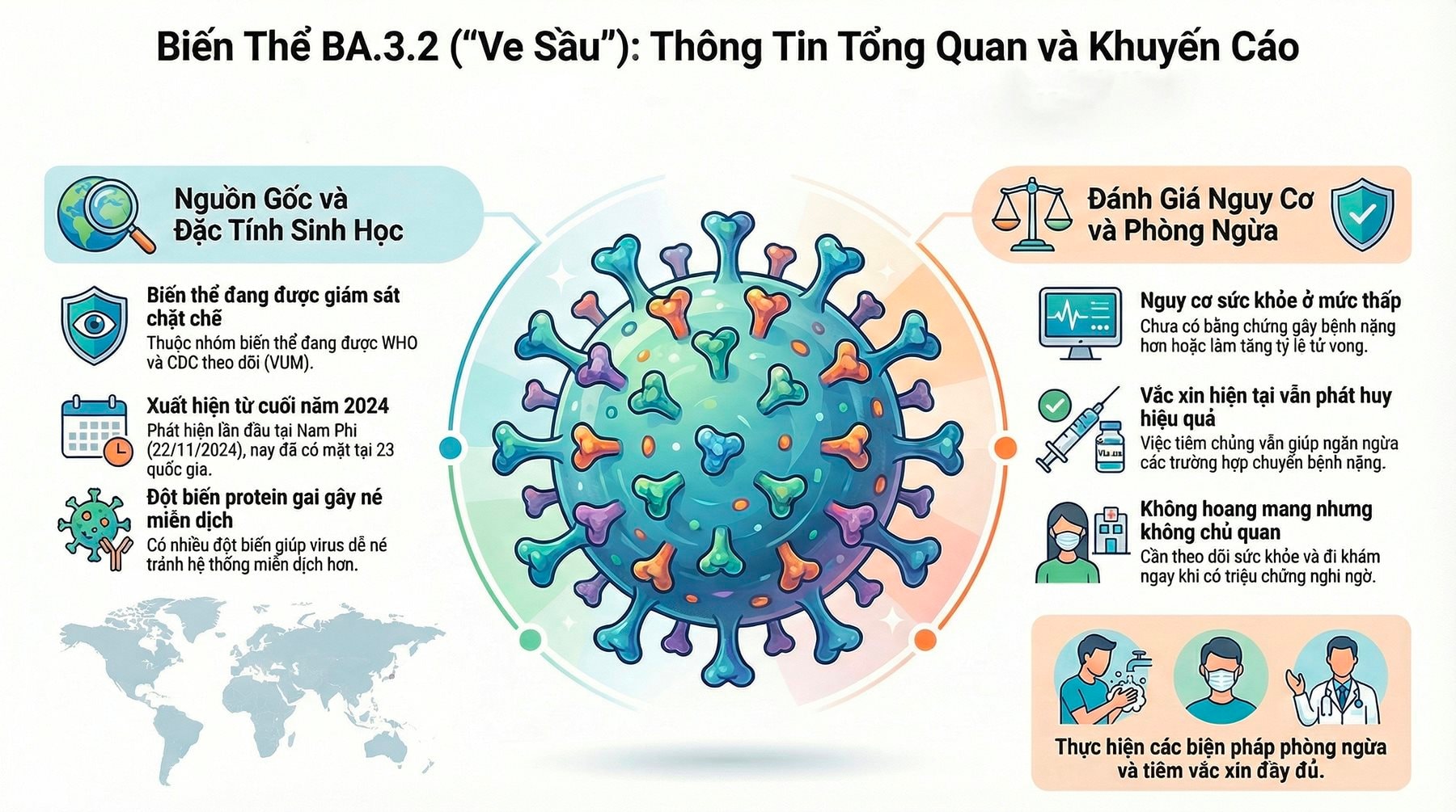 Đặc điểm của biến thể BA.3.2 là có nhiều đột biến trên protein gai, thành phần giúp virus xâm nhập vào tế bào người. Một số nghiên cứu trong phòng thí nghiệm cho thấy biến thể này có khả năng né tránh miễn dịch ở mức nhất định. Đây cũng là lý do biến thể được ví như “ve sầu”, do có thể tồn tại âm thầm trong cộng đồng trước khi lan rộng.