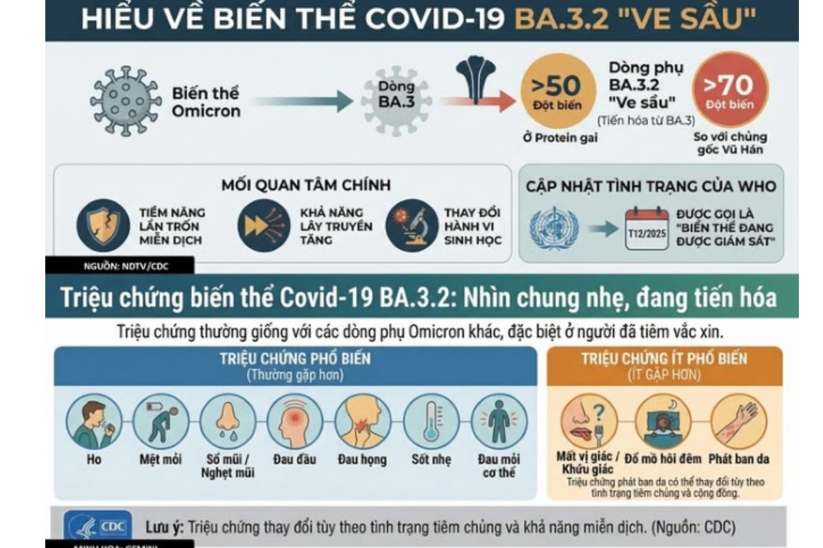 Đáng chú ý, đến thời điểm hiện tại, chưa có bằng chứng cho thấy biến thể BA.3.2 gây bệnh nặng hơn so với các biến thể trước đây. Các cơ quan y tế trên thế giới vẫn đang tiếp tục theo dõi, đánh giá để có những khuyến cáo phù hợp.