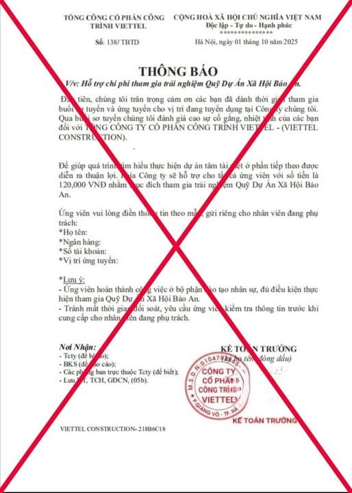Cũng thời điểm này, Viettel Construction (Tổng Công ty cổ phần công trình Viettel) đã phải phát cảnh báo về việc lừa đảo online giả mạo con dấu và chữ ký tạo văn bản tuyển dụng của doanh nghiệp và "hỗ trợ ứng viên số tiền 120.000 đồng nhằm trải nghiệm quỹ Dự án Xã hội Bảo An” nhằm chiếm đoạt tiền và tài khoản cùng thông tin cá nhân của nạn nhân để lừa đảo các bước tiếp theo.