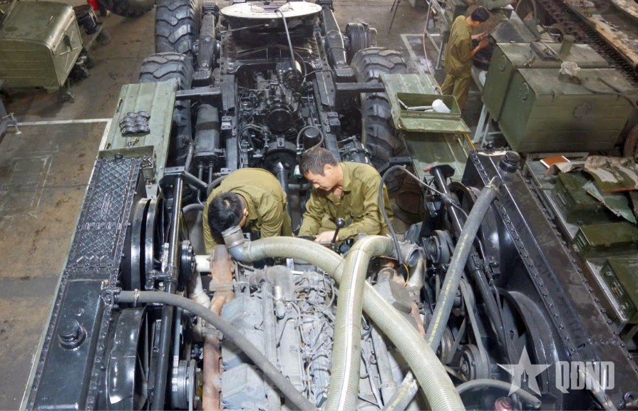 Sửa chữa đồng bộ xe chở tăng tại Xưởng X201. Ảnh: VĂN DUY