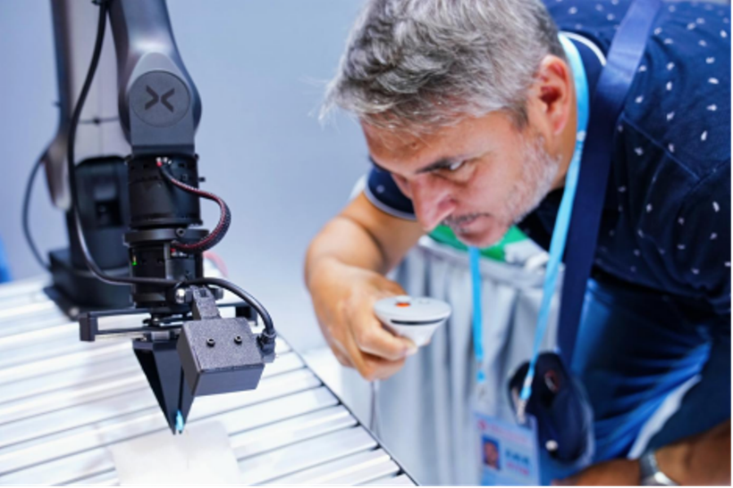 Gian hàng của OYMotion thu hút đông người đến xem robot tay linh hoạt. Một kỹ sư thao tác trình diễn loại “tay máy thông minh giá rẻ cho doanh nghiệp vừa và nhỏ” – có thể dùng trong lắp ráp công nghiệp hoặc phân loại nông sản.