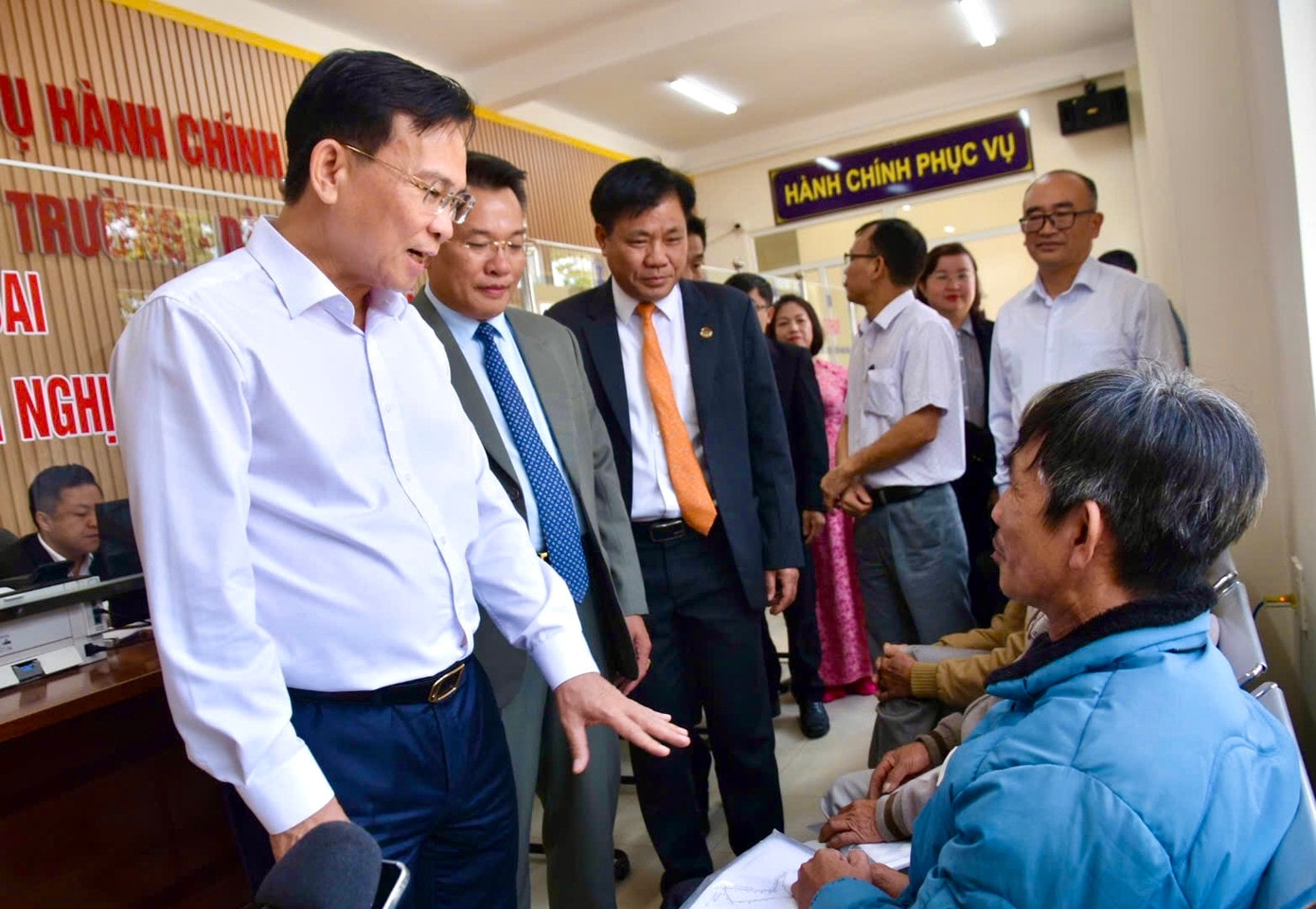 Chủ tịch UBND tỉnh Lâm Đồng Hồ Văn Mười (bìa trái) động viên thăm hỏi người dân đến làm thủ tục tại cơ sở.
