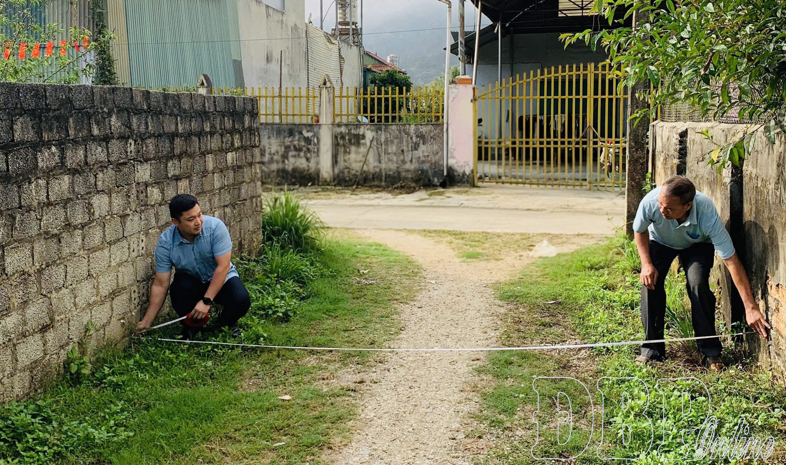 Anh Nguyễn Quang Dũng (bên trái) khảo sát, đánh giá hiện trạng tuyến đường theo kiến nghị của cử tri thôn 9, xã Sam Mứn.