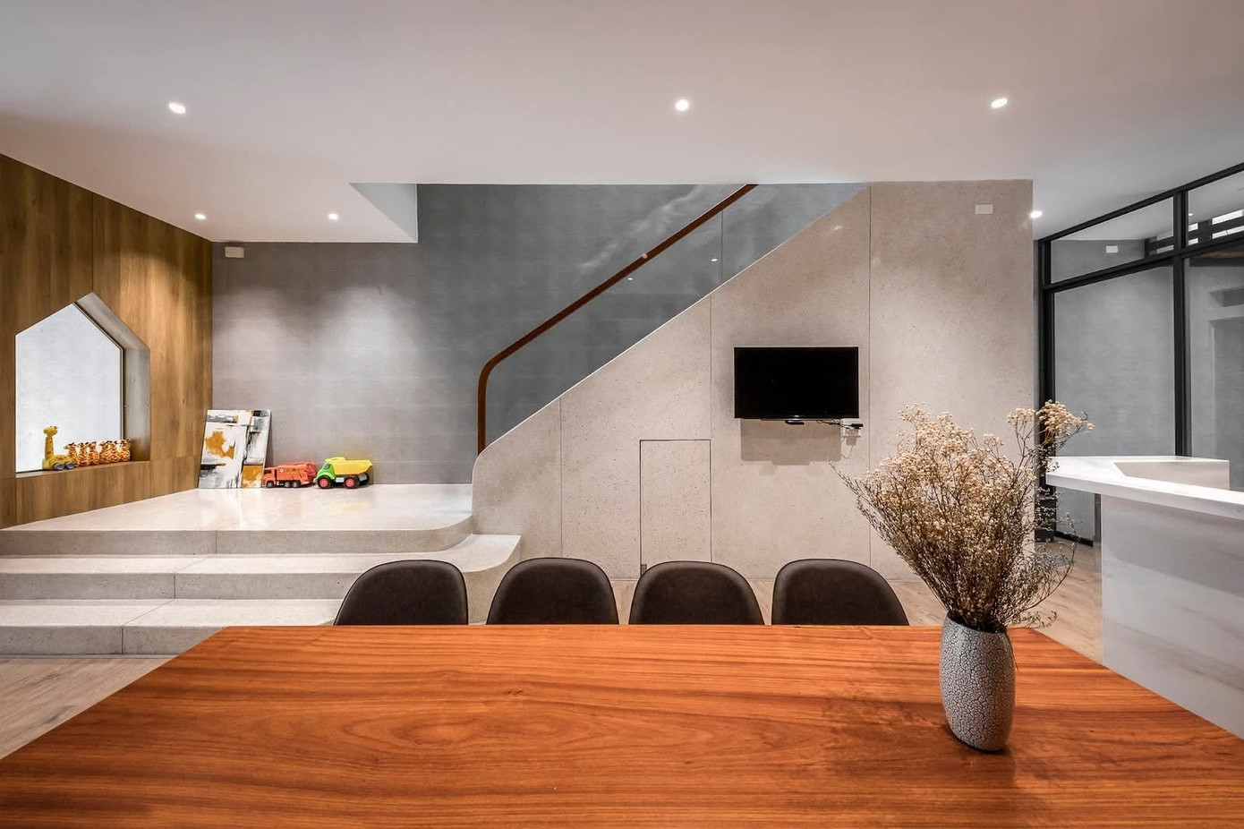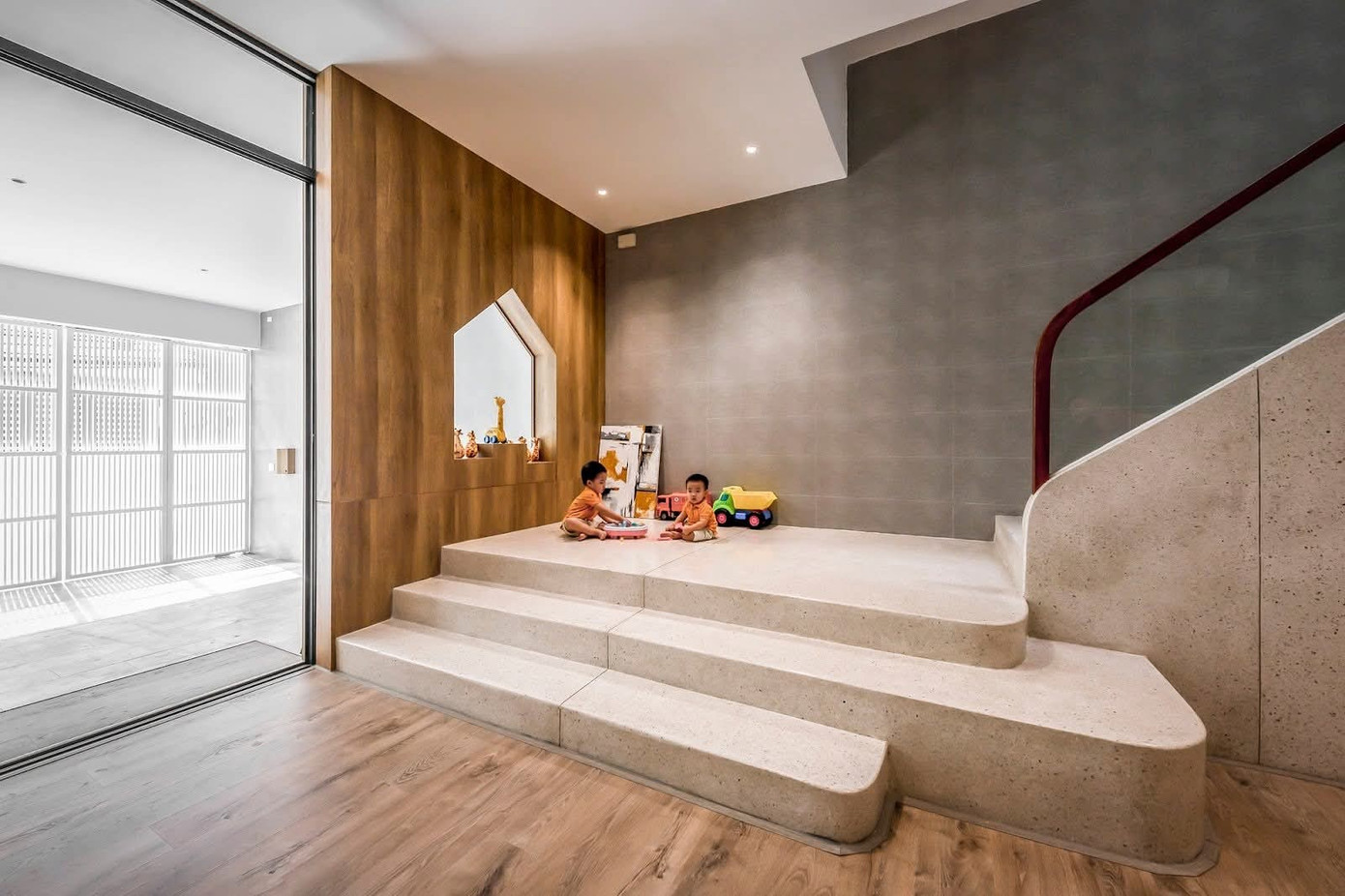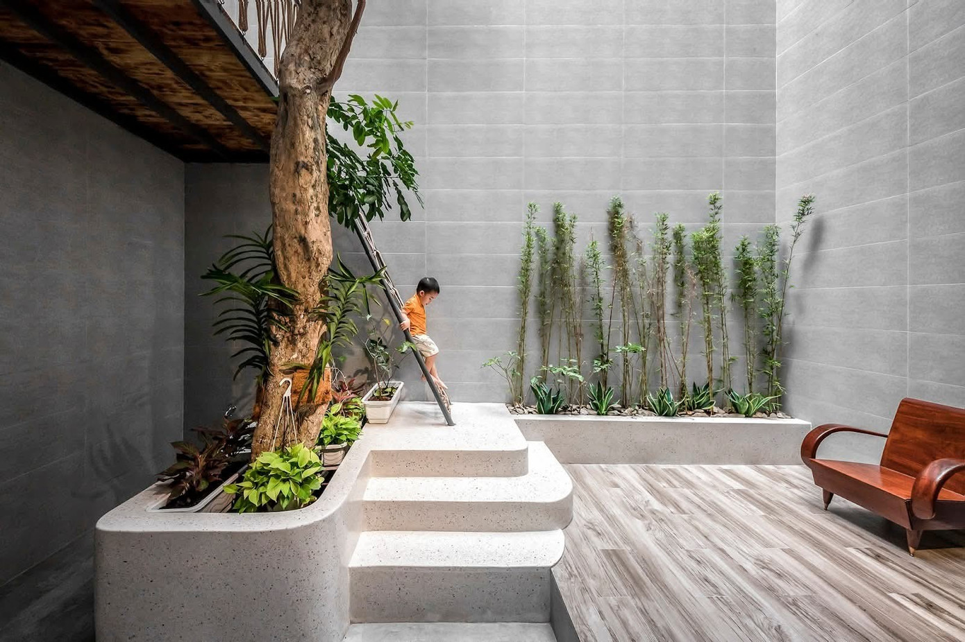 Bên trong ấn tượng với khoảng sân trong dạng xẻ khe là nơi trồng cây xanh, uống trà thư giãn và sân chơi ngoài trời của trẻ em.