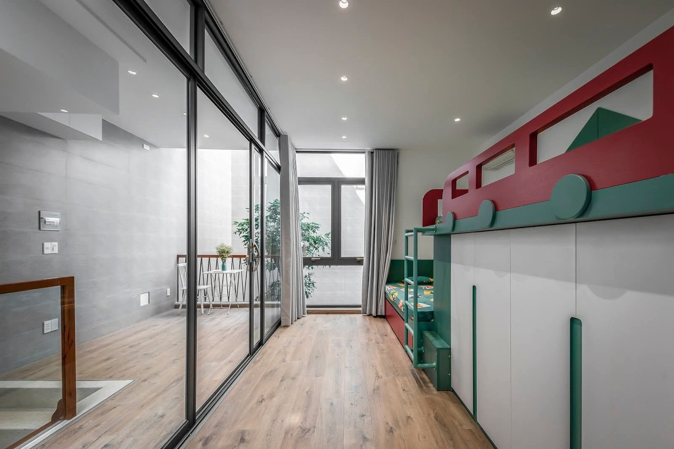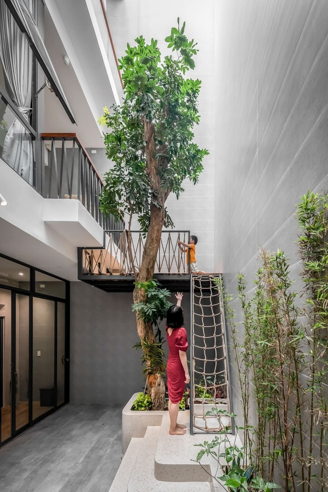 Phòng khách được thu hẹp, một số phòng ngủ được giảm bớt, và giường tầng được thiết kế cho hai bé, tạo ra không gian dư thừa để trồng cây xanh, xây hồ bơi và nhà trên cây cho các em vui chơi.