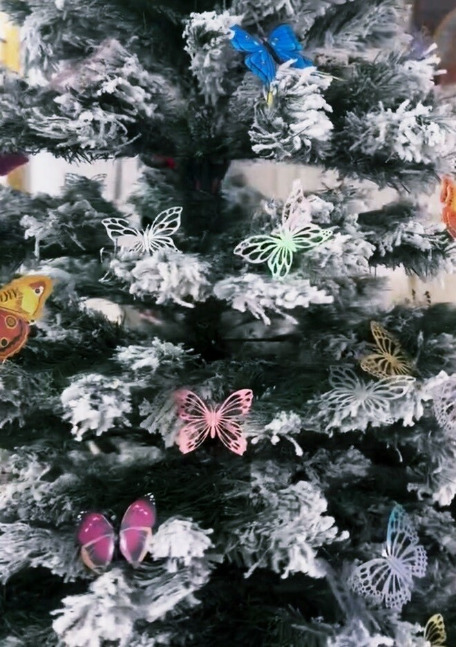 Cây thông phủ tuyết trắng được trang trí bằng hàng loạt chú bướm cánh mỏng đủ màu sắc. Ảnh: FBNV