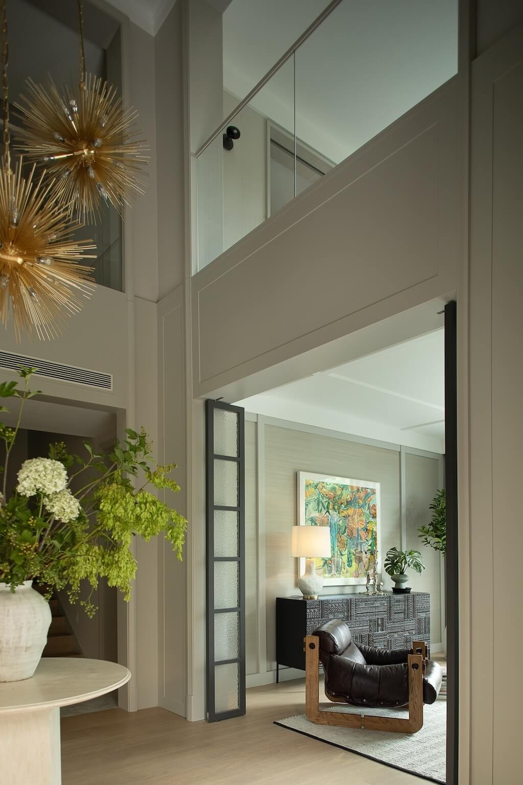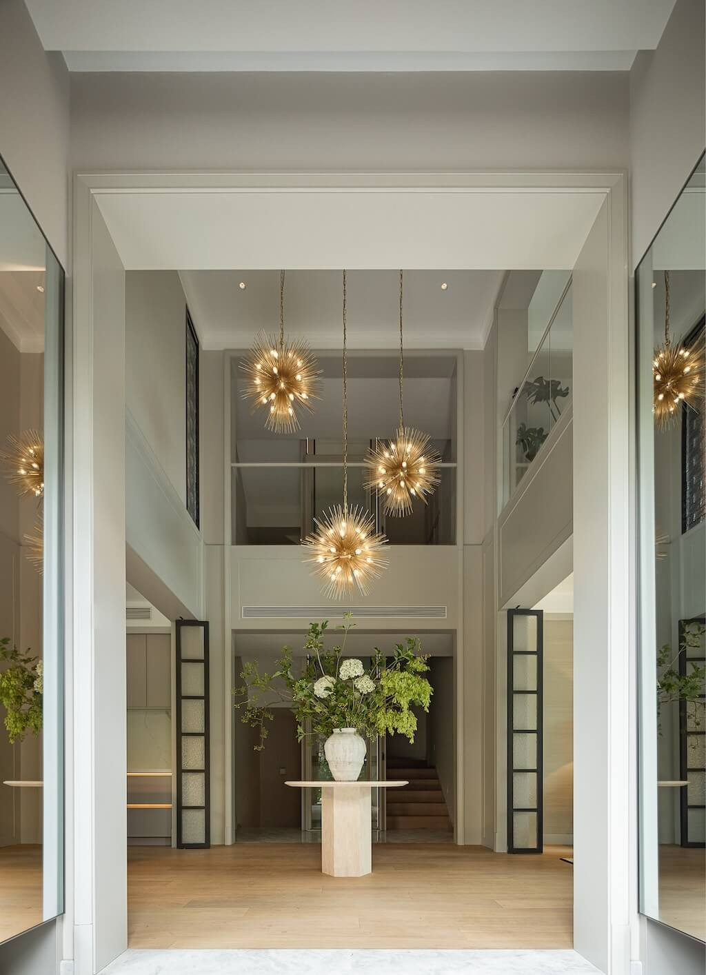 Lối vào nhà ấn tượng với khoảng trần cao và cụm đèn thả mô phỏng hình khối bồ công anh rực sáng.