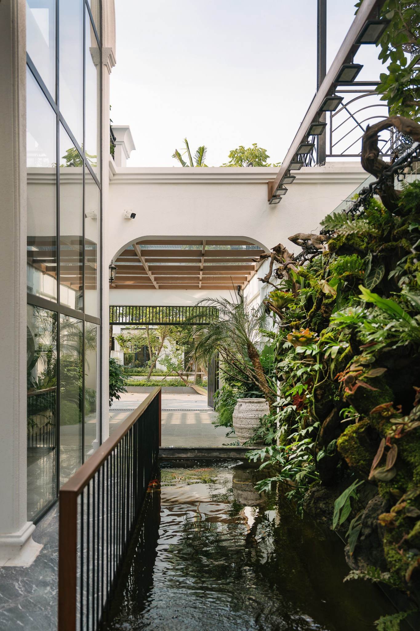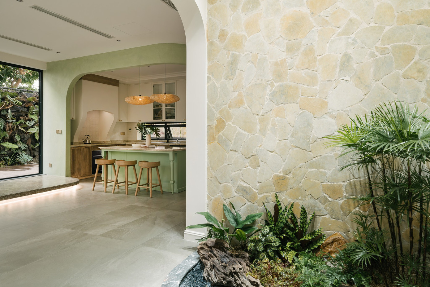 Ở một góc độ khác, KTS chủ trì cũng chia sẻ về ý tưởng về một khu vườn trải dài như một dải không gian xanh có thể được nhìn thấy từ mọi góc của dự án. Không chỉ xuất phát từ cấu trúc sẵn có của biệt thự mà còn dựa trên ý niệm về “một cuộc đi bộ nhận thức” dành cho chủ nhà. KTS muốn thông qua lối giao thông và các khu vườn được sắp đặt, đưa hành trình thở chậm và kết nối sâu với gia đình diễn ra song song với hành trình trở về nhà của gia chủ.