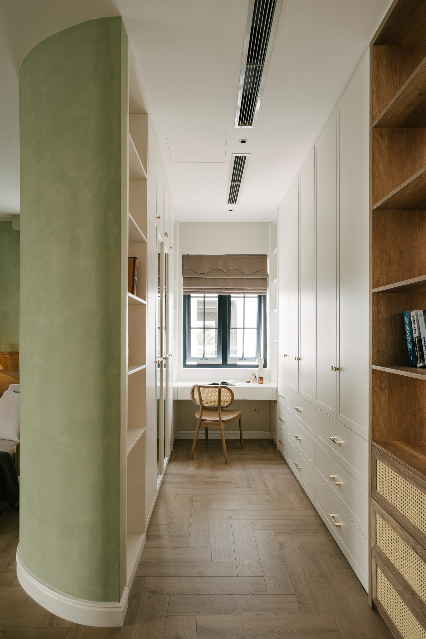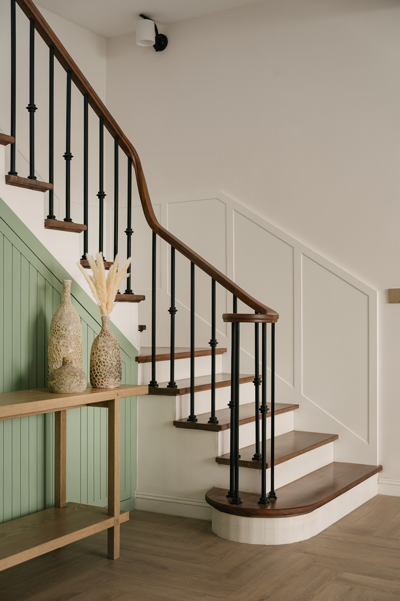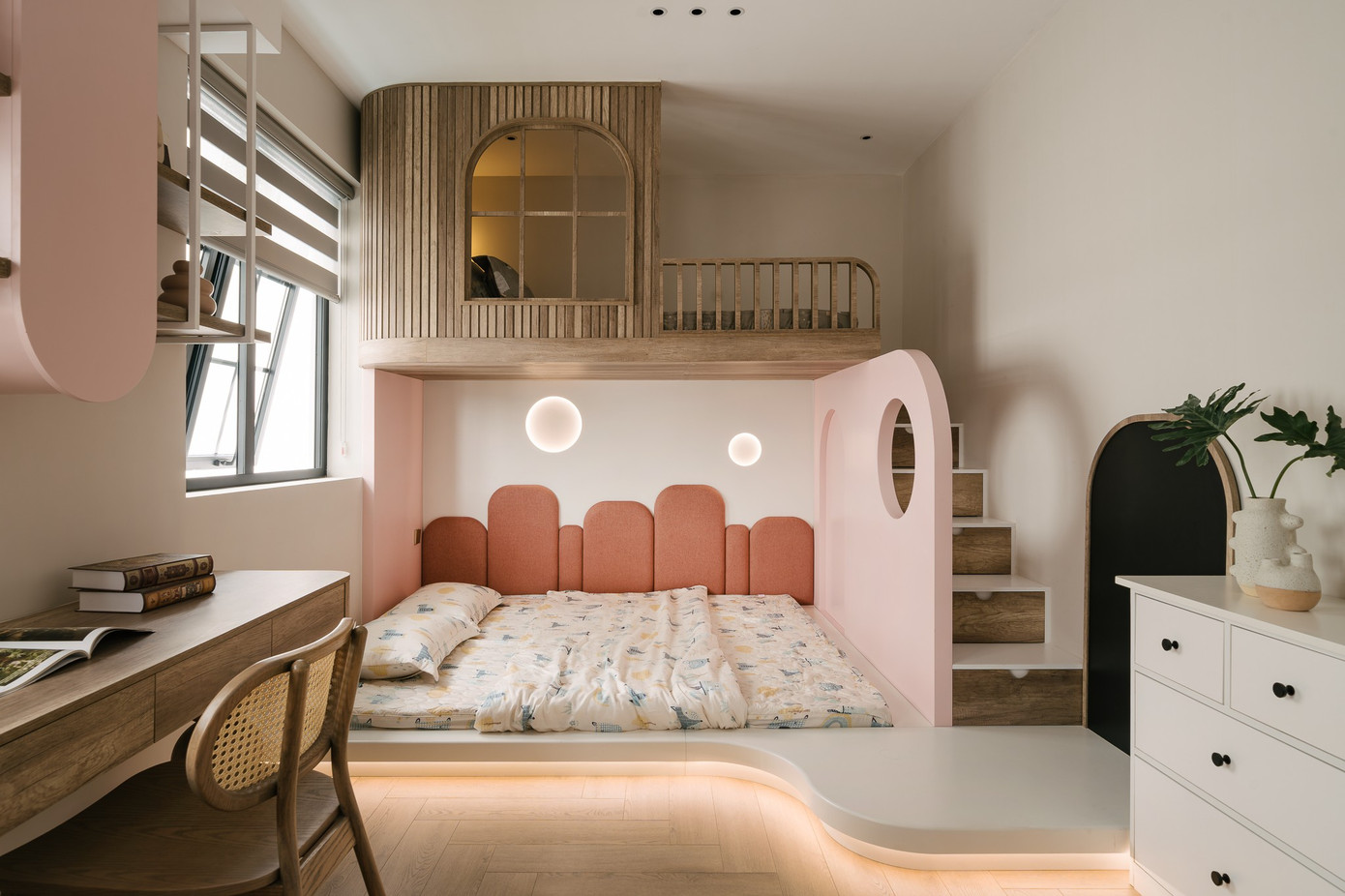 Chuyển tiếp khối chung ở tầng một sang khối riêng gồm các phòng ngủ, phòng làm việc và vệ sinh ở tầng hai và ba là trục thang bộ qua khoảng thông tầng. Nhờ trục thang và các ô cửa được sắp xếp hợp lý, công trình luôn duy trì được trạng thái “thở” đều đặn, mát mẻ và thông suốt.