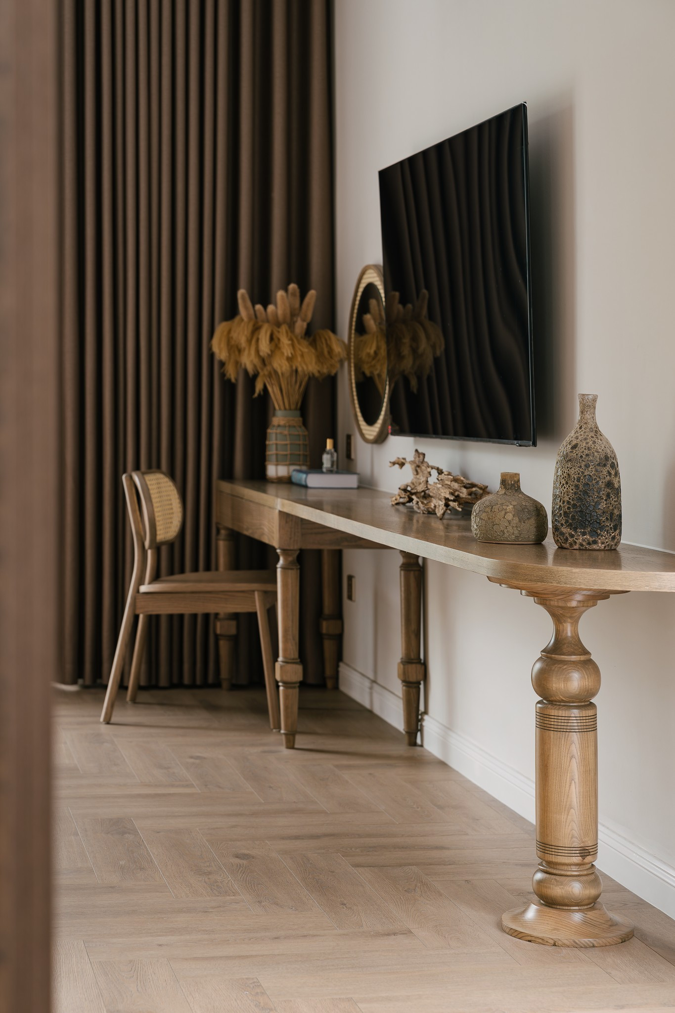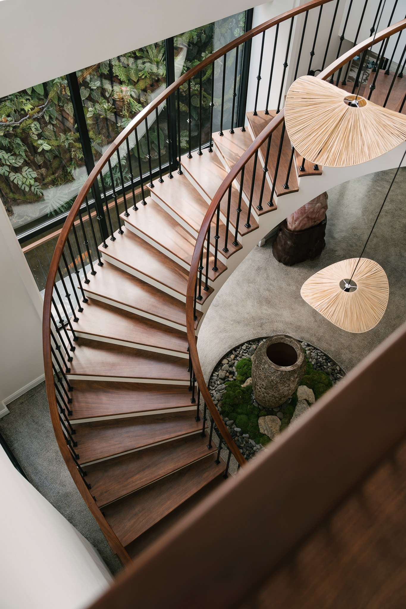 Tầng một là dòng chảy liên tục bao gồm sảnh, phòng khách, khu đa năng nâng sàn và thang xoắn song song với khu vực bàn ăn, đi qua các khu vườn khô dẫn đến không gian bếp rộng rãi có lối mở ra vườn sau. Từ đây gia chủ có thể tiếp tục vòng qua vườn hông bên ngoài, men theo hồ cá tới sân trước để quay trở lại cửa chính vào nhà.
