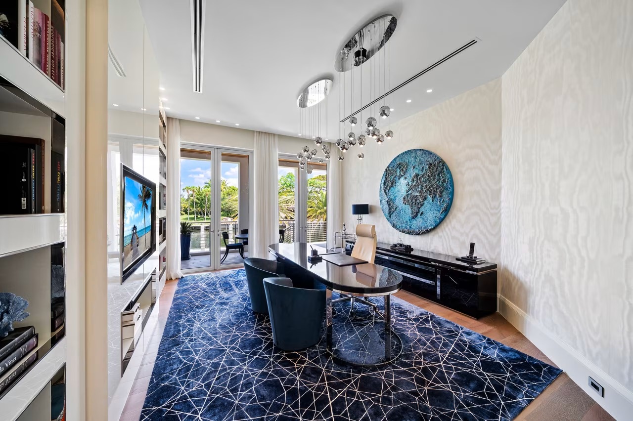 Phòng làm việc được bài trí gọn gàng với thảm xanh đậm họa tiết đan chéo, một chiếc bàn lớn ở trung tâm và hai ghế bọc nhung. Bức tranh hình trái đất tạo điểm nhấn chính cho căn phòng, bên cạnh có hai cửa kính lớn mở ra khu vực ban công.