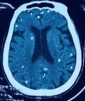 Nhiều nốt cản quang trong nhu mô não của người bệnh. Ảnh: BVCC.
