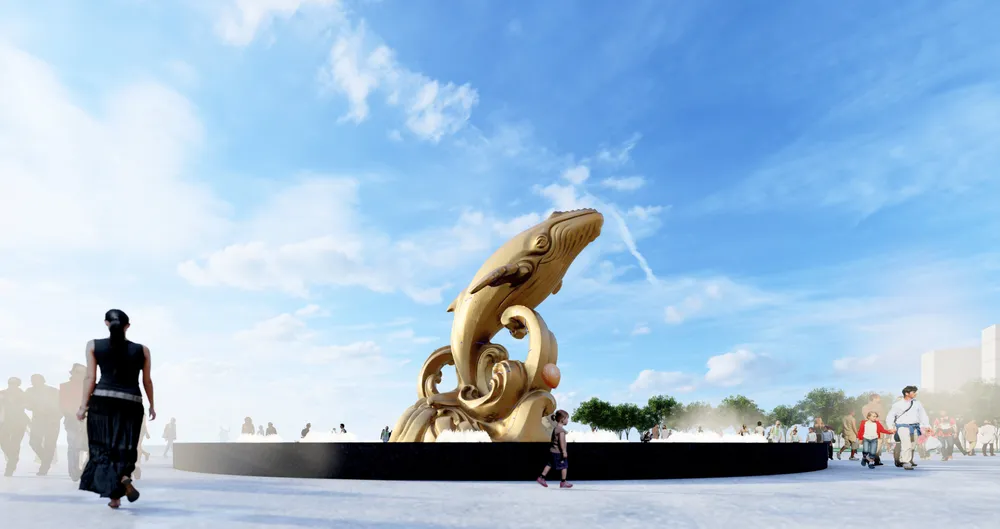 Phối cảnh biểu tượng Cá Ông xung quanh có hệ thống vòi phun nước, đèn chiếu sáng.