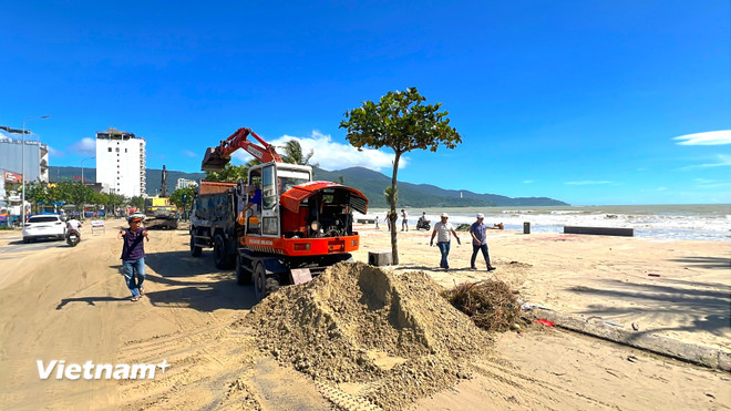 Công ty Cổ phần Cầu Đường Đà Nẵng bố trí 2 xe đào, 6 xe tải các loại và gần 100 công nhân, chia thành các nhóm nhỏ theo từng đoạn tuyến. Lực lượng này tập trung thu hồi cát đổ dồn về bãi biển, đồng thời phân tách rác để chuyển giao cho đơn vị môi trường. Cát sau sàng được bổ sung lại bãi để hạn chế xói lở, giữ cao độ bờ biển.