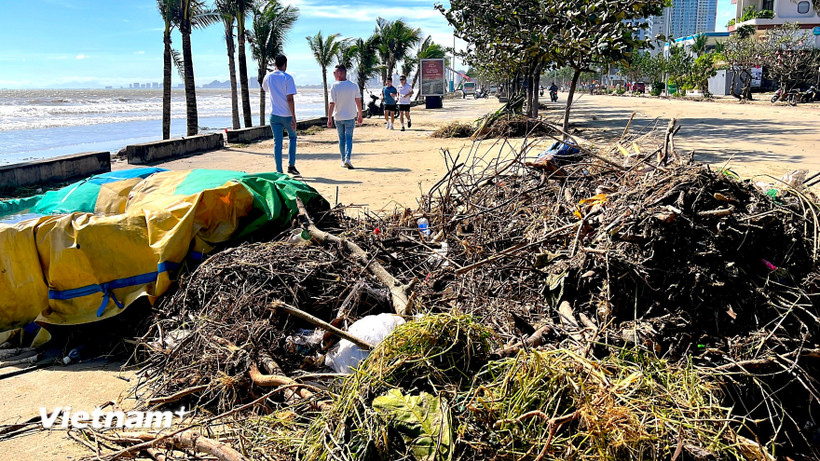 Rác và cát phủ kín vỉa hè mặt đường ven biển Đà Nẵng. (Ảnh: Thanh Phong/Vietnam+)