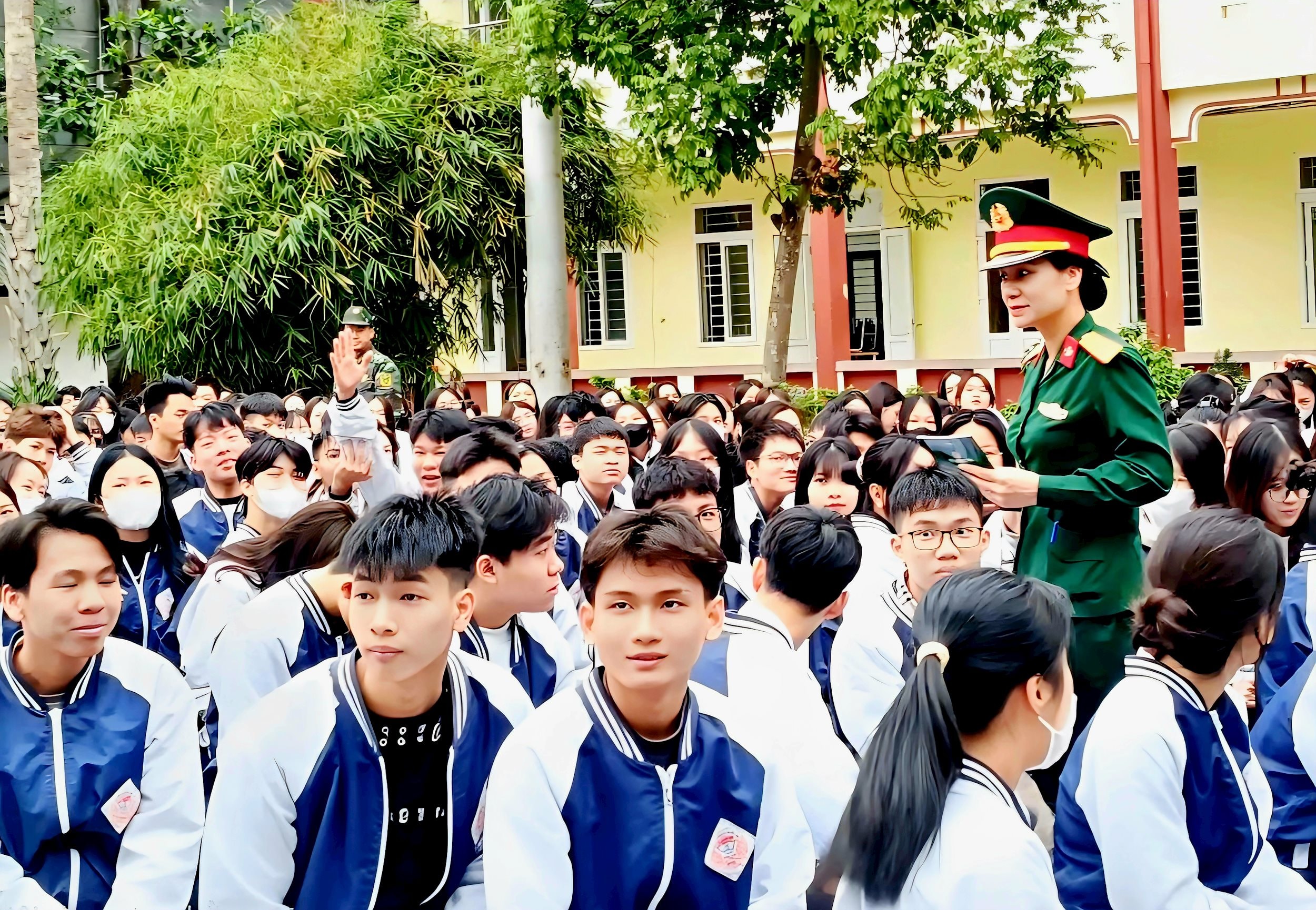 Cán bộ chiến sĩ Binh chủng Công binh phát tờ rơi tuyên truyền pháp luật cho học sinh trường THPT Vân Tảo, Hà Nội.