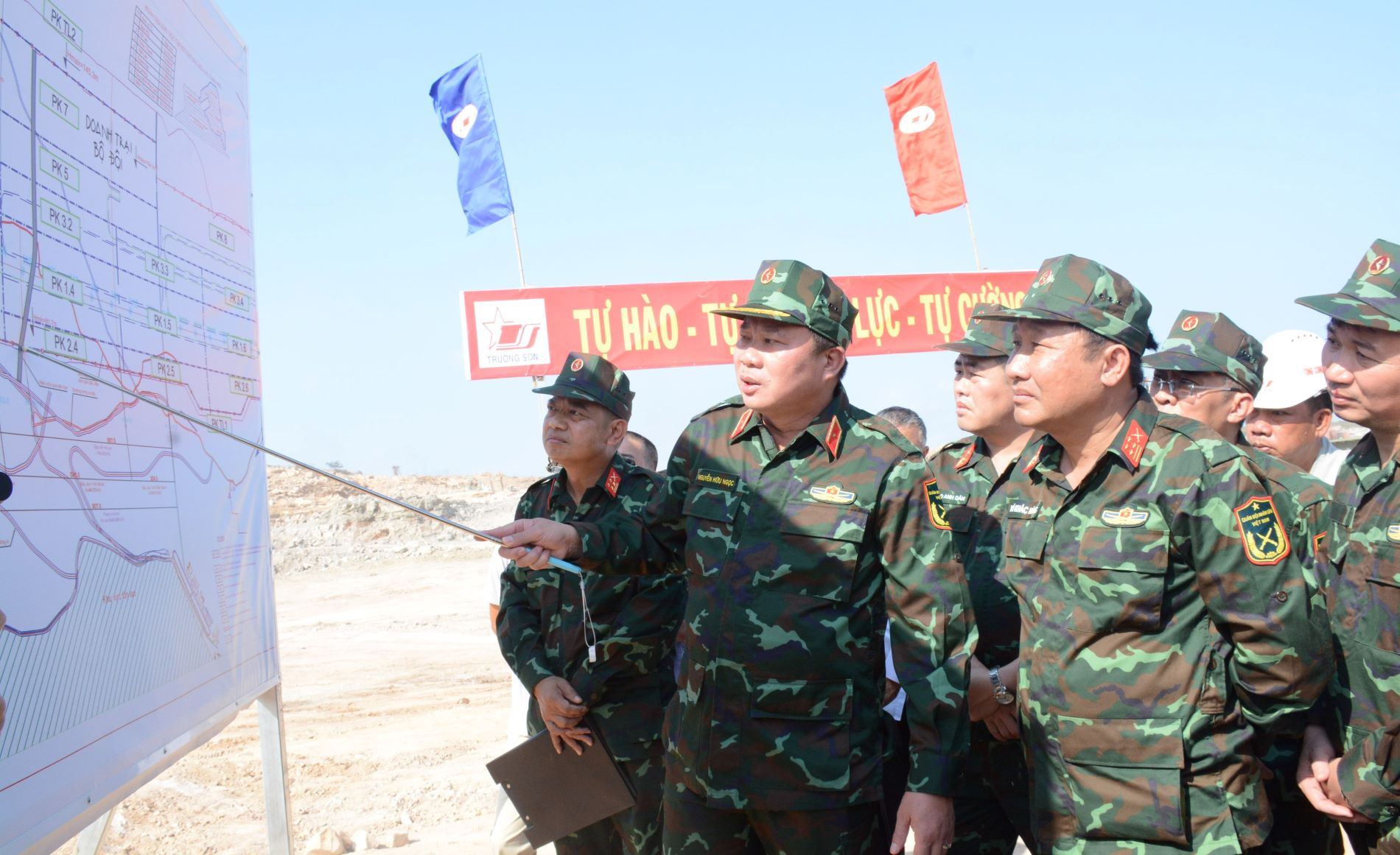 Thiếu tướng Nguyễn Hữu Ngọc, Tư lệnh Binh đoàn 12 và các đồng chí lãnh đạo Binh đoàn kiểm tra công tác thi công tại công trường.