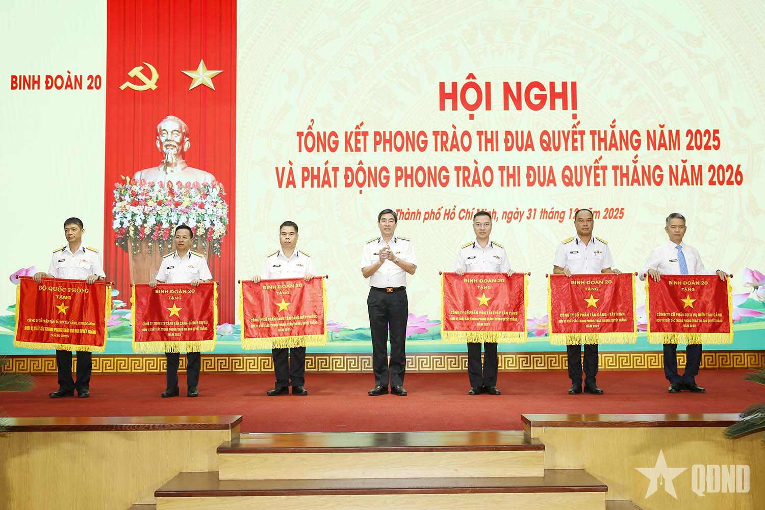 Thiếu tướng Ngô Minh Thuấn trao cờ của Bộ Quốc phòng và Binh đoàn 20 tặng các đơn vị tiêu biểu năm 2025.