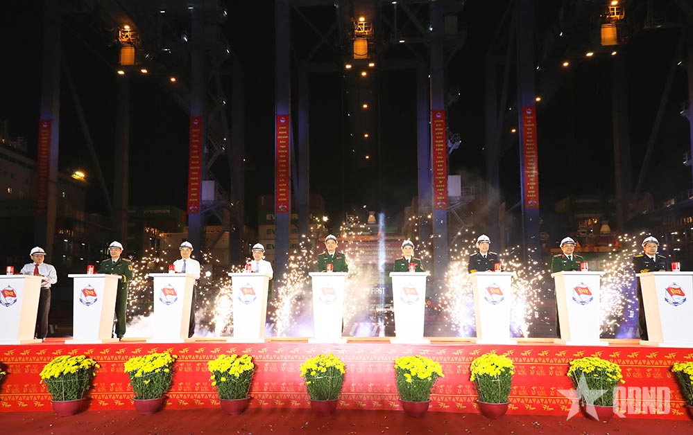 Các đại biểu thực hiện nghi thức phát lệnh làm hàng đầu xuân tại cảng Tân Cảng - Cát Lái.