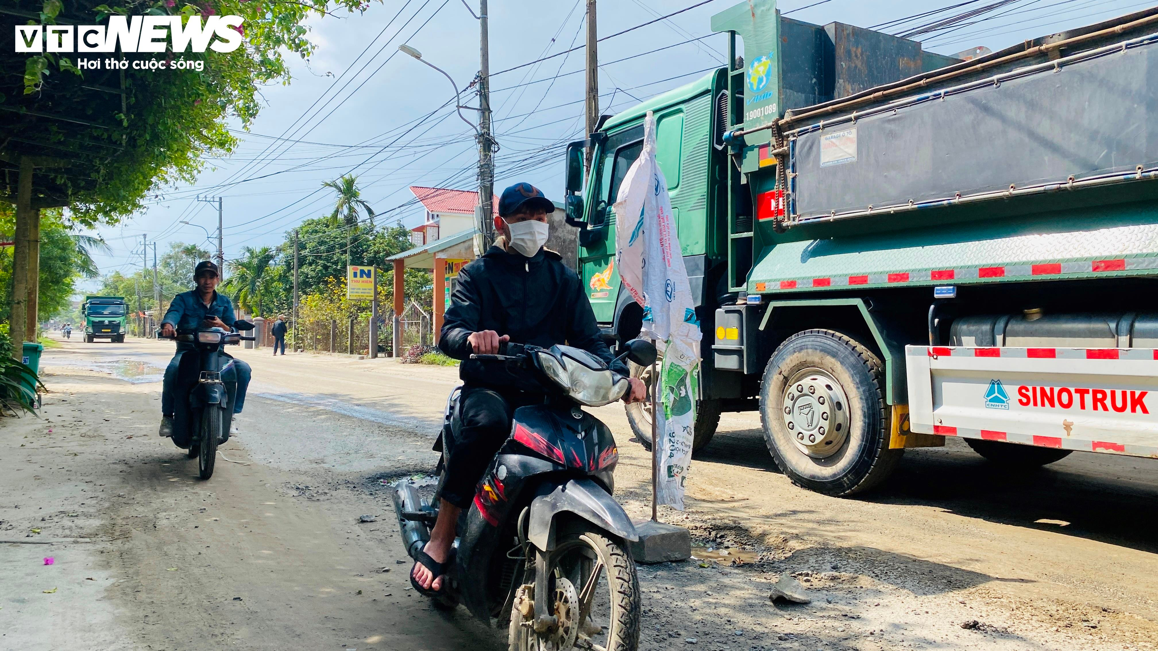 Người dân chạy xe máy phải luồn lách qua các chướng ngại vật với xung quanh là "binh đoàn" xe tải tiềm ẩn nguy hiểm.