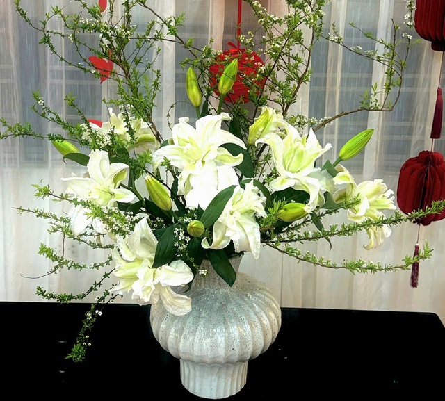Theo chị Son, loại bình chị mua là dáng đèn lồng, phía ngoài nhẵn mịn nhưng được trang trí giống như vỏ quả trứng chim cút, nên nhìn rất bắt mắt. Dáng bình rất phù hợp để cắm hoa tuyết mai kết hợp với hoa ly.