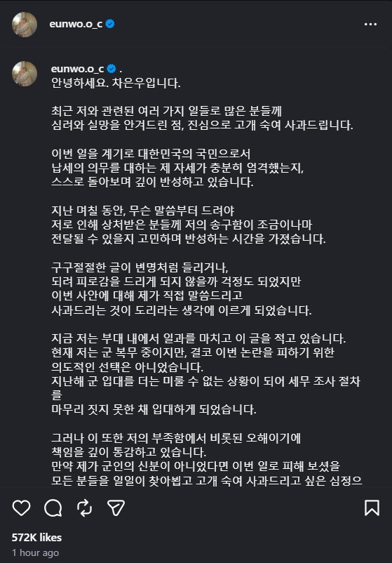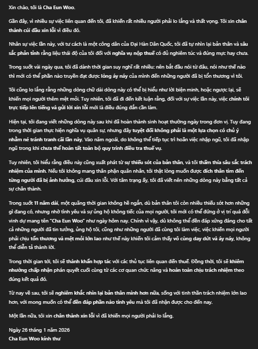 Bài xin lỗi của Cha Eun Woo (Bản dịch này có sử dụng hỗ trợ của ChatGPT)